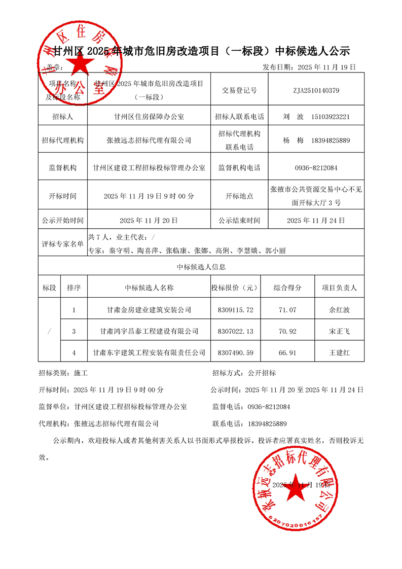 [市本级]甘州区2025年城市危旧房改造项目(一标段)中标候选人公示