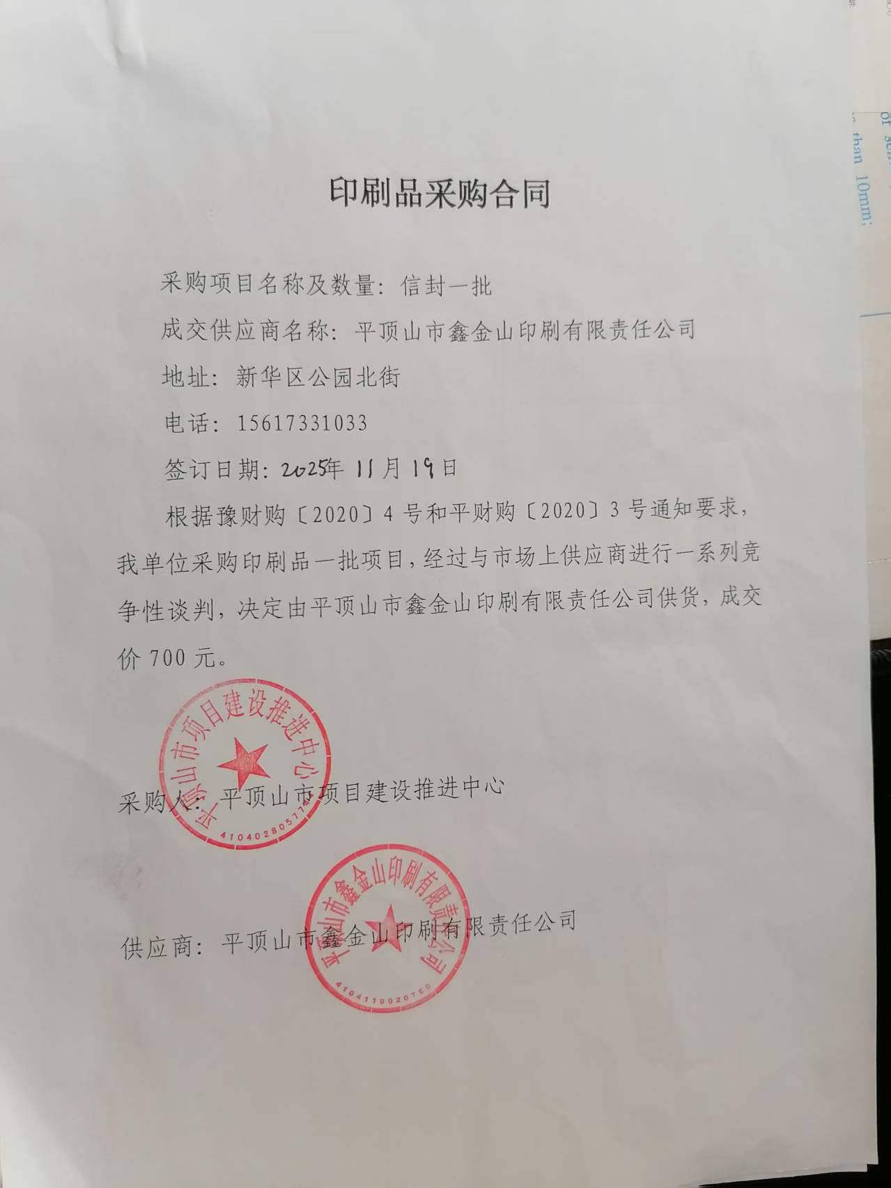 | 二、合同名称:平顶山市项目建设推进中心信封印刷项目 | ||||||||||||
