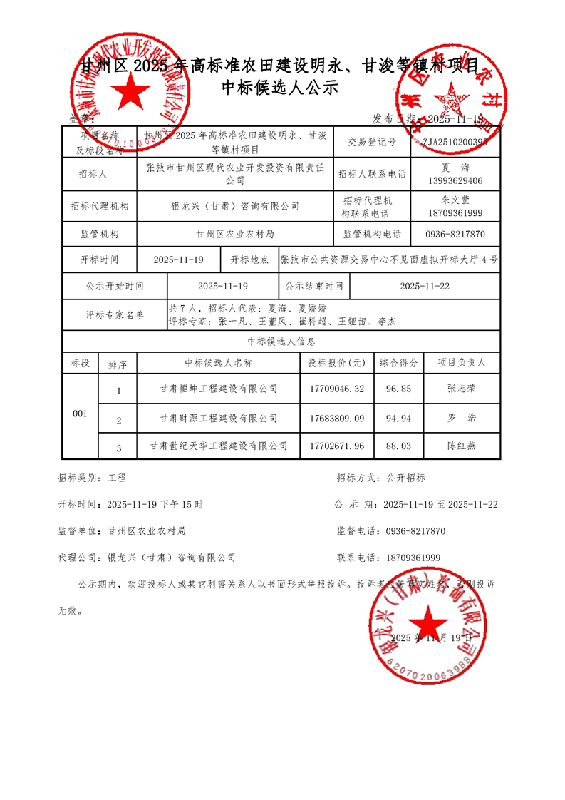 [市本级]甘州区2025年高标准农田建设明永、甘浚等镇村项目中标候选人公示