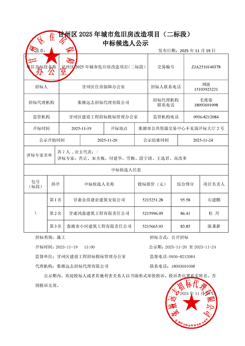 [市本级]甘州区2025年城市危旧房改造项目(二标段)中标候选人公示