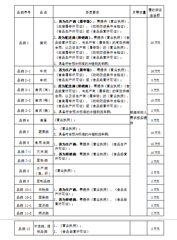 ②品类*(牛肉、羊肉类)、品类*(鸡鸭鹅):若为生产商(屠宰场),需提供《营业执照》、《畜禽屠宰许可证》、《动物防疫条件合格证》、《食品生产许可证》或《食品经营许可证》;若为配送商(经销商),需提供《营业执照》《食品经营许可证》、与生产商(屠宰场)的有效供销合同,以及该生产商(屠宰场)的《营业执照》、《畜禽屠宰许可证》、《动物防疫条件合格证》、《食品生产许可证》或《食品经营许可证》;