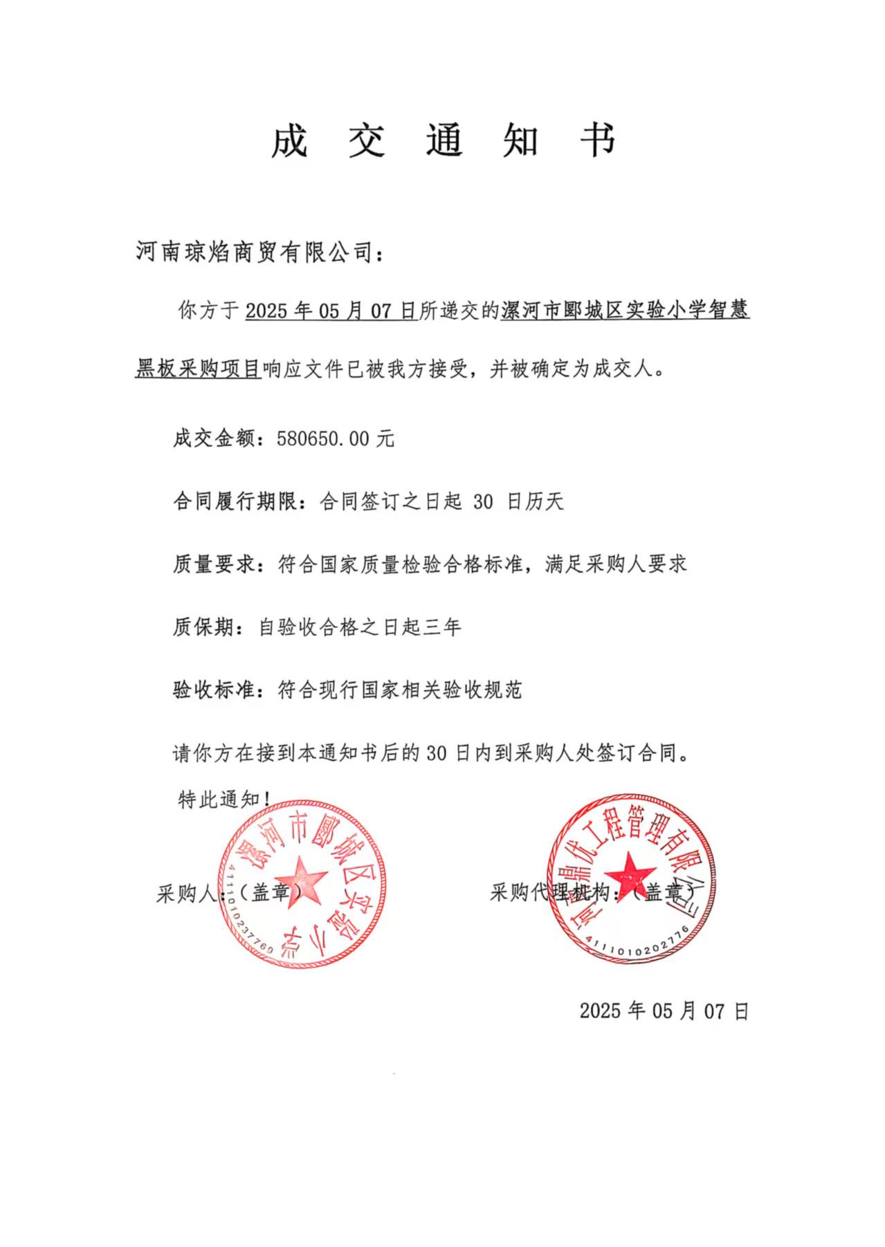 | 二、合同名称:漯河市郾城区实验小学智慧黑板采购项目 | ||||||||||||