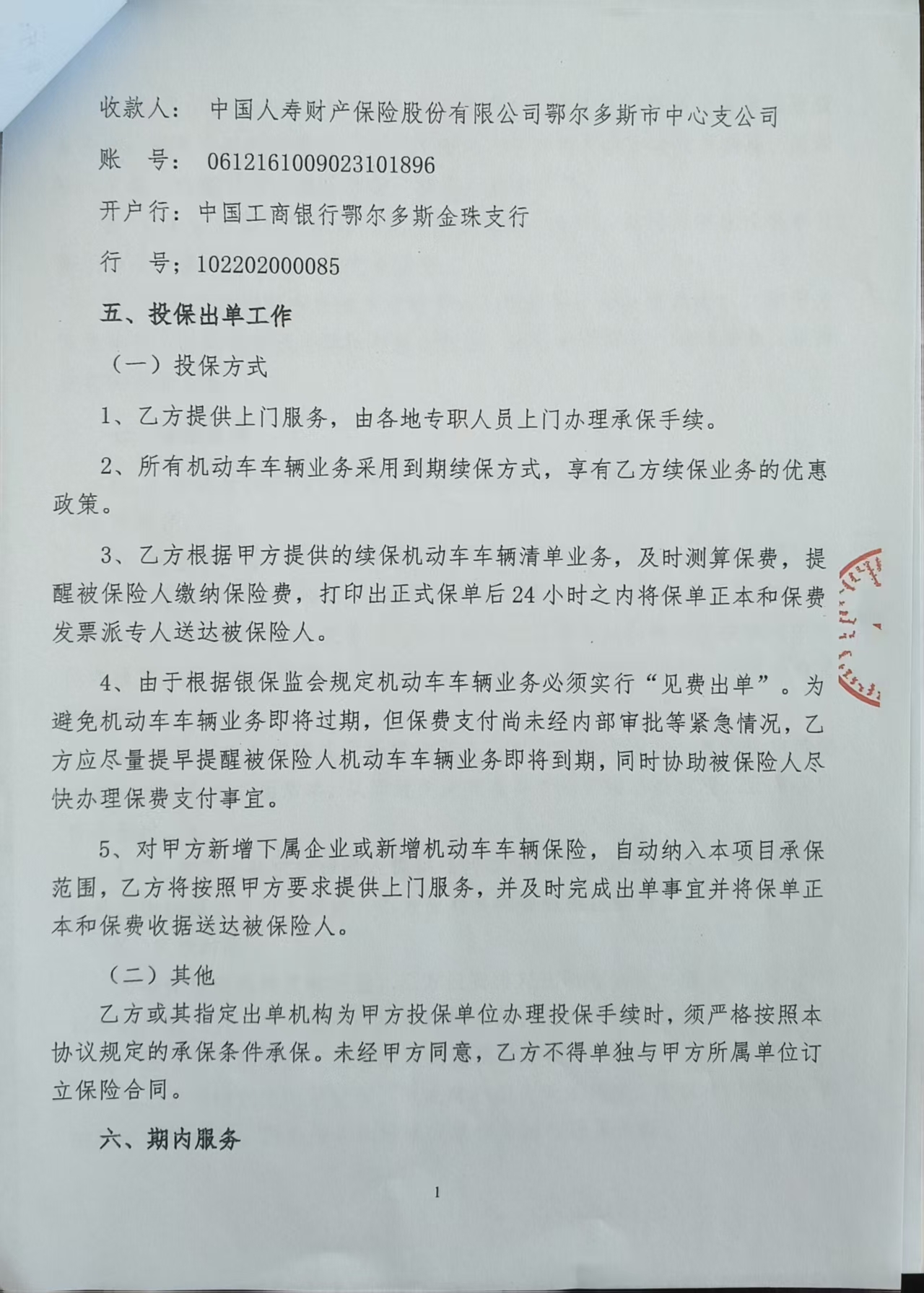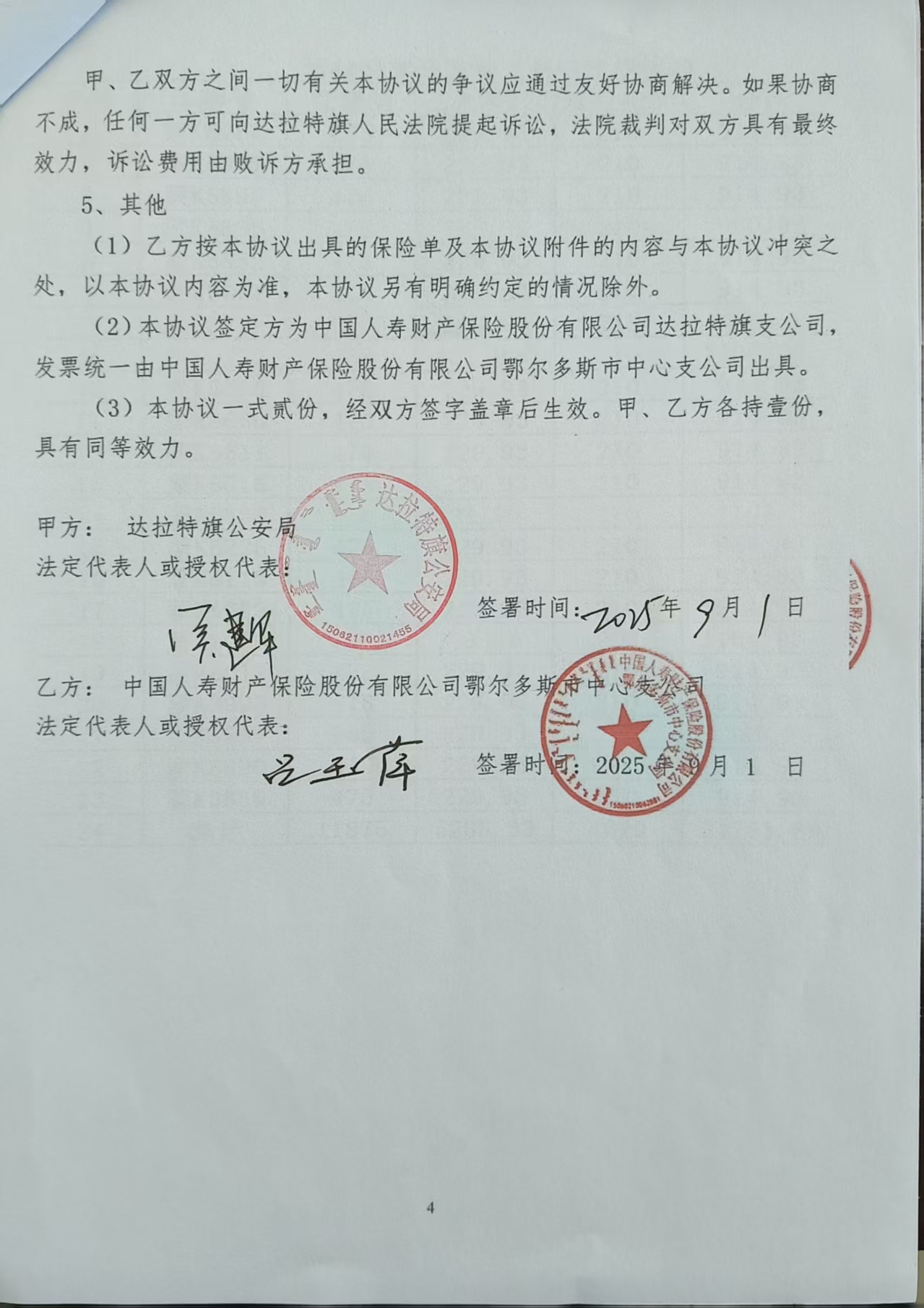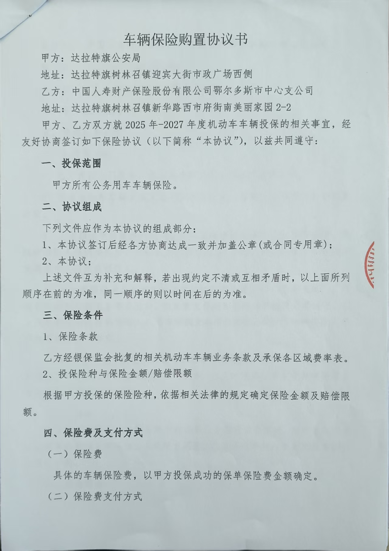 一、合同编号:********二、合同名称:车辆保险购置协议书三、项目编号:鄂财购备字(电子)[****]*******号四、项目名称:车辆保险费五、合同主体采购人(甲方):达拉特旗公安局 地址:鄂尔多斯市达拉特旗 联系方式:*********** 供应商(乙方):中国人寿财产保险股份有限公司鄂尔多斯市中心支公司 地址:内蒙古自治区鄂尔多斯市东胜区内蒙古自治区鄂尔多斯市东胜区天骄街道鄂托克西街北迎宾路东鑫隆综合商务楼**楼西北侧 **楼整层 联系方式:*********** 六、合同主要信息主要标的: