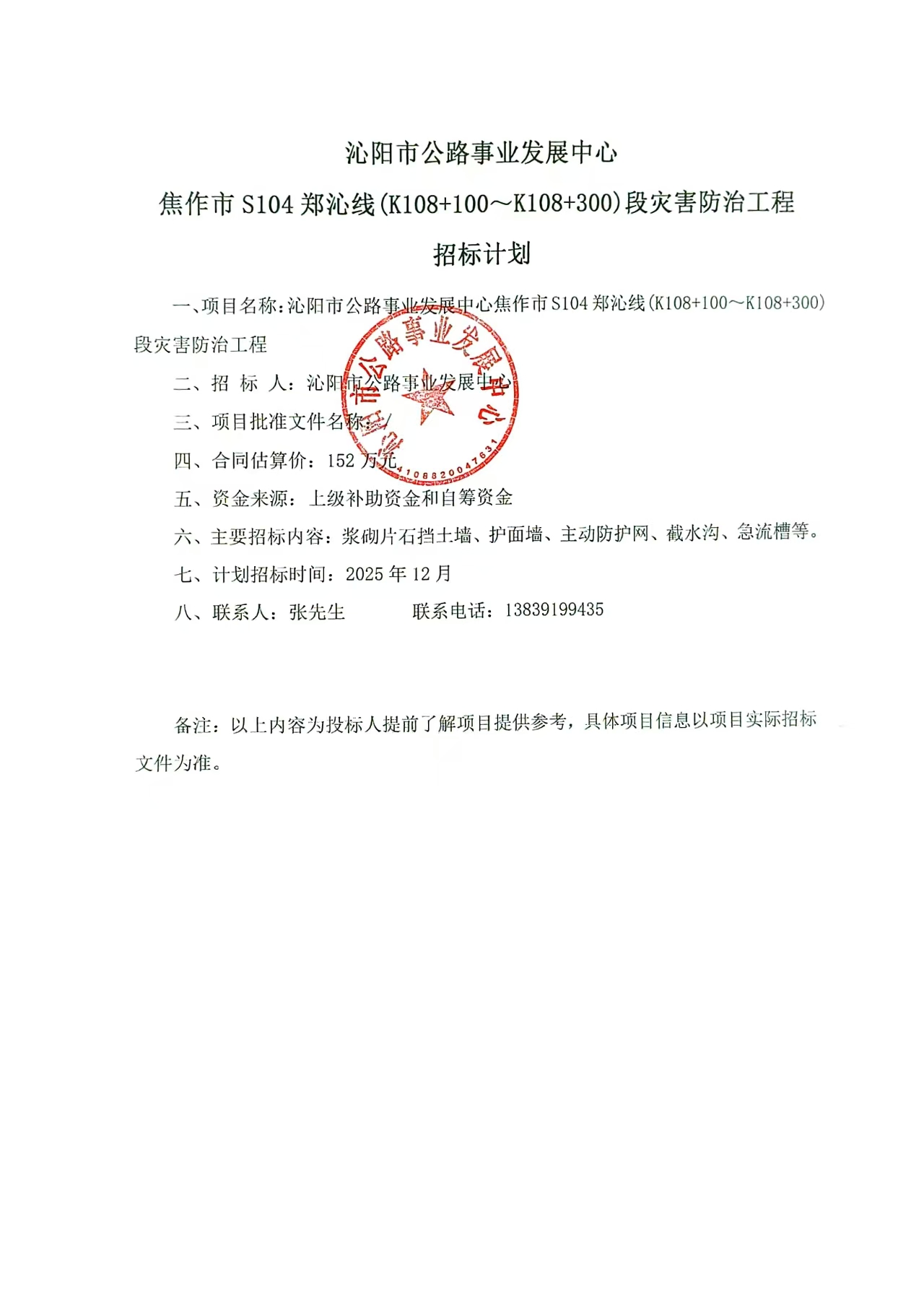 沁阳市公路事业发展中心焦作市S104郑沁线(K108+100~K108+300)段灾害防治工程招标计划