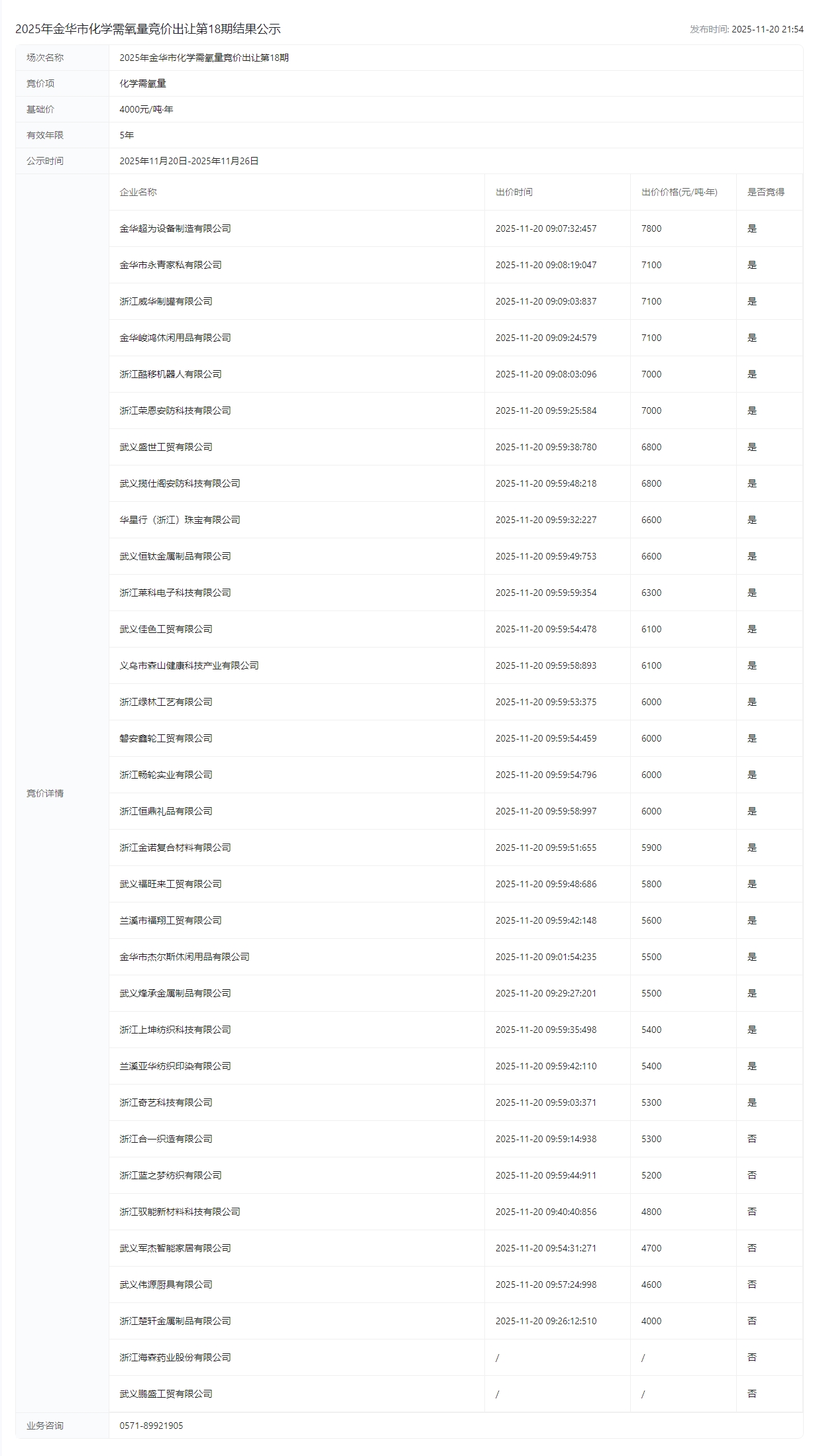 华市化学需氧量竞价出让第18期结果公示成交公示