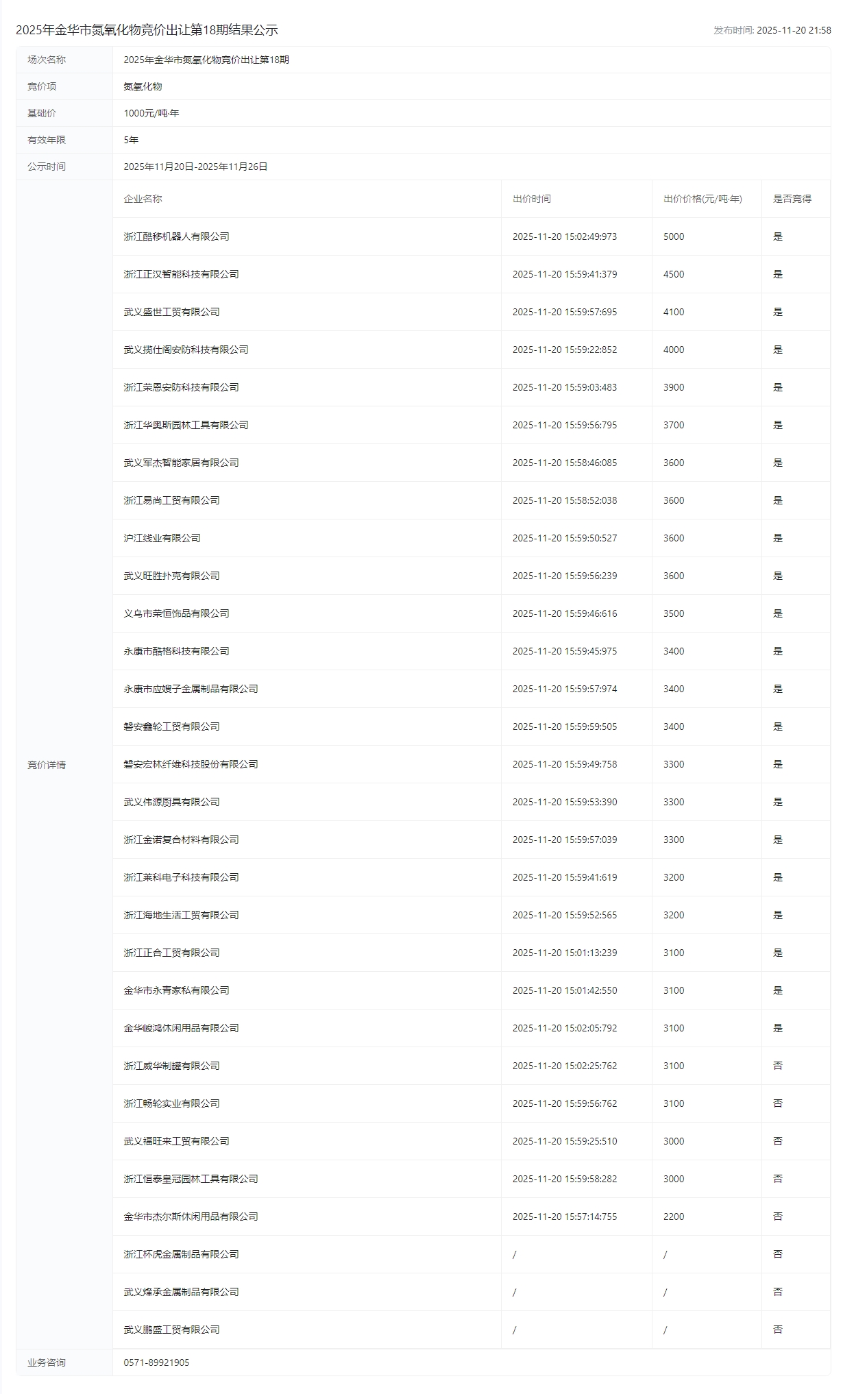 华市氮氧化物竞价出让第18期结果公示成交公示
