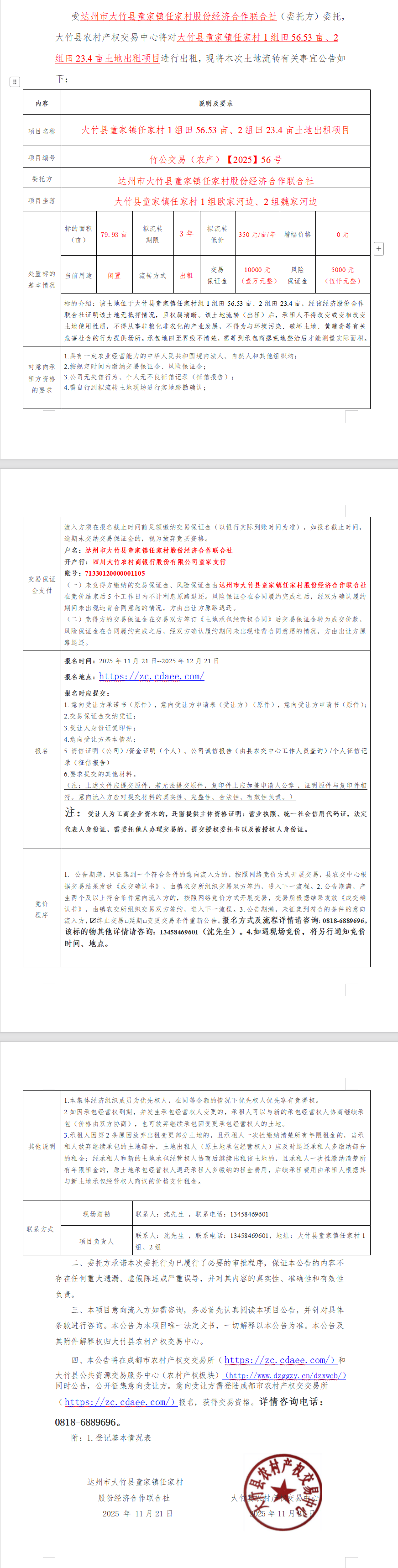 大竹县童家镇任家村*组田**.**亩、*组田**.*亩土地出租项目
