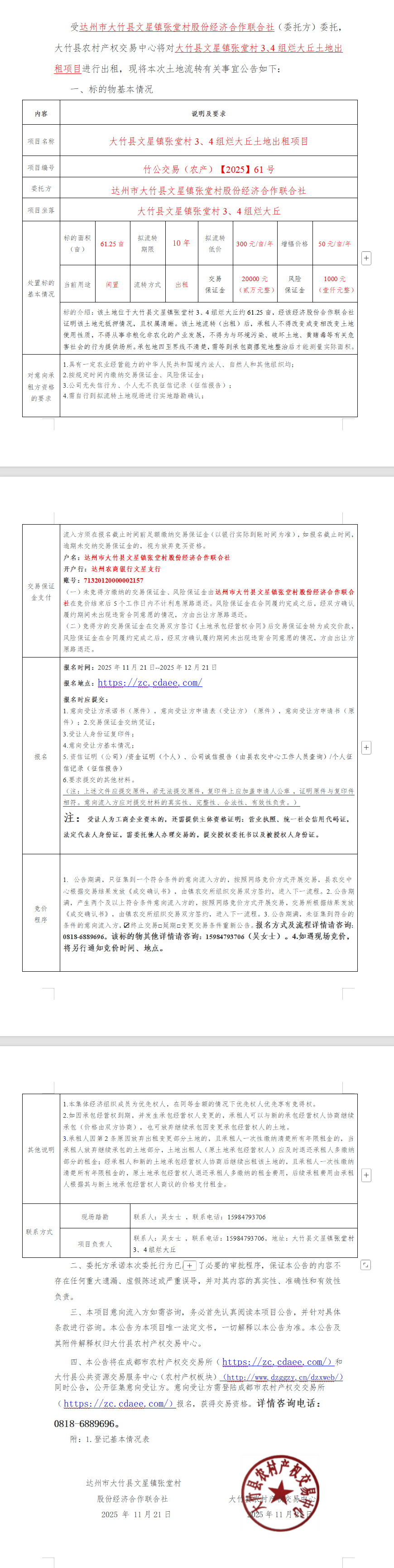大竹县文星镇张堂村*、*组烂大丘土地出租项目