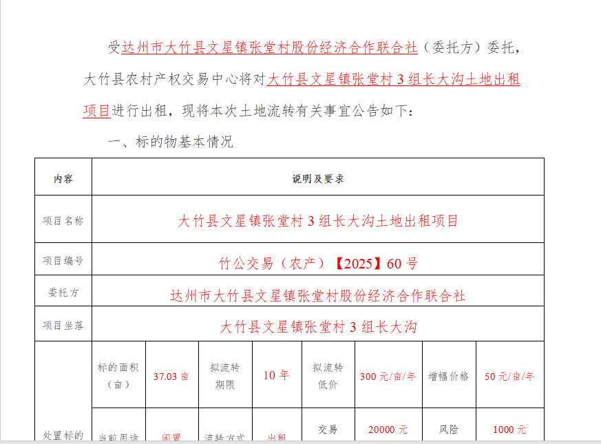 大竹县文星镇张堂村3组长大沟土地出租项目