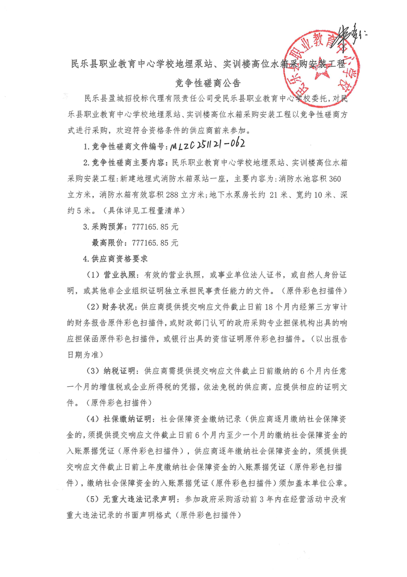 民乐县职业教育中心学校地埋泵站、实训楼高位水箱采购安装工程