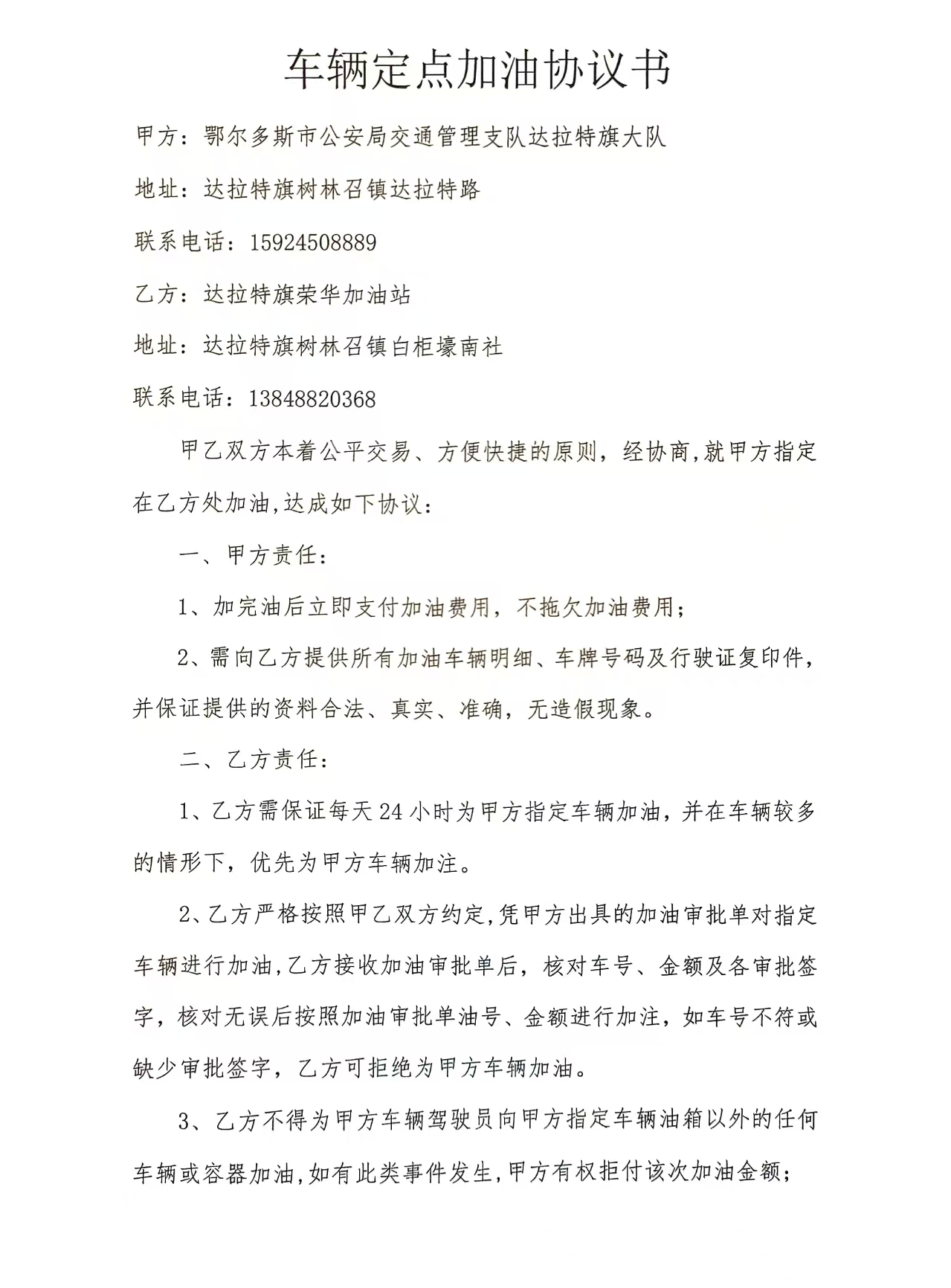 鄂尔多斯市公安局交通管理支队达拉特旗大队210辅线中队荣华加油站加油项目合同书政府采购合同公告