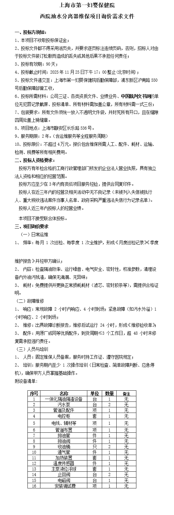 上海市第一妇婴保健院西院油水分离器维保项目询价需求文件