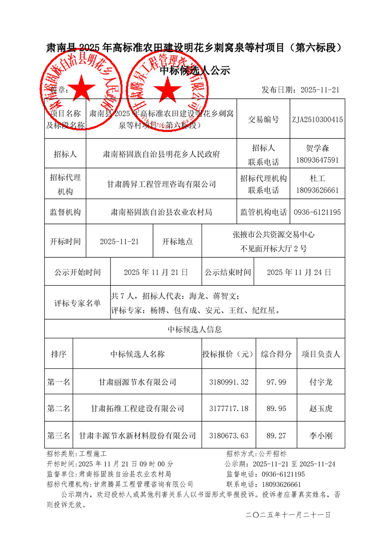 [市本级]肃南县2025年高标准农田建设明花乡刺窝泉等村项目(第六标段)中标候选人公示交易结果公示