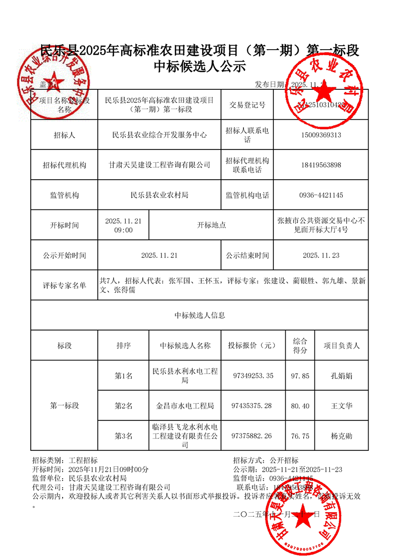 [市本级]民乐县2025年高标准农田建设项目(第一期)第一标段中标候选人公示