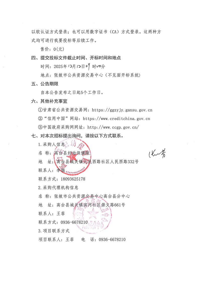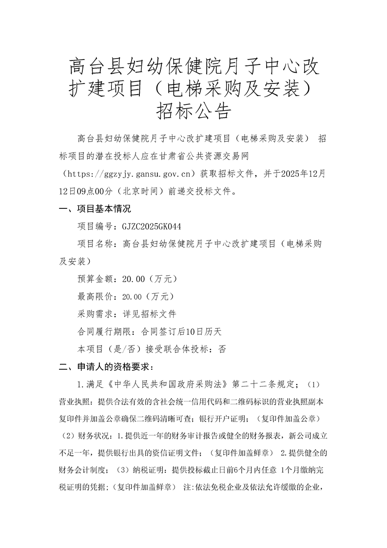 高台县妇幼保健院月子中心改扩建项目(电梯采购及安装)招标公告