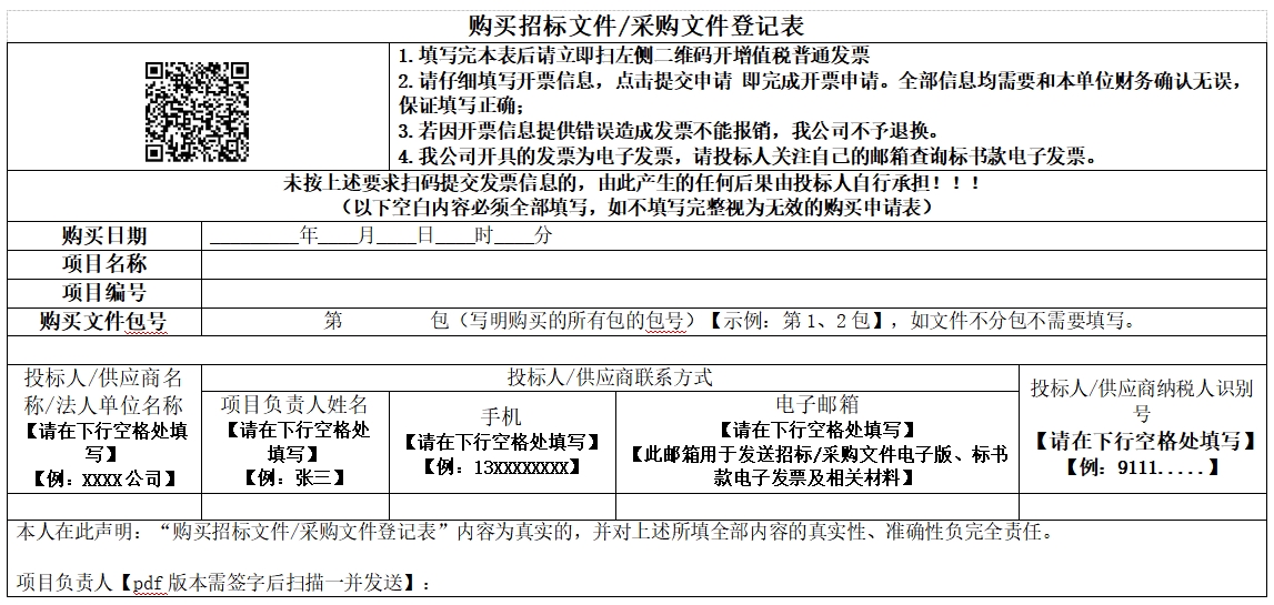 方式:请电汇购买议标文件。议标文件售价为***元人民币,售后不退。有兴趣的供应商可在****年**月**日至****年**月**日期间每个工作日下午**:**(北京时间)前汇款(不接受个人汇款)至采购代理机构指定账户,汇款时请必须注明“*********标书款”。汇款后请将汇款凭证和填写完毕的《购买招标文件/采购文件登记表》(*份可编辑的****版本及*份不可编辑的***版本),同时以电子邮件形式发送至********@***.**.**。采购代理机构工作日当日**:**时前收到邮件的于当日发送议标文件电子版,**:**时后收到的将视为是下一个工作日收到的邮件。