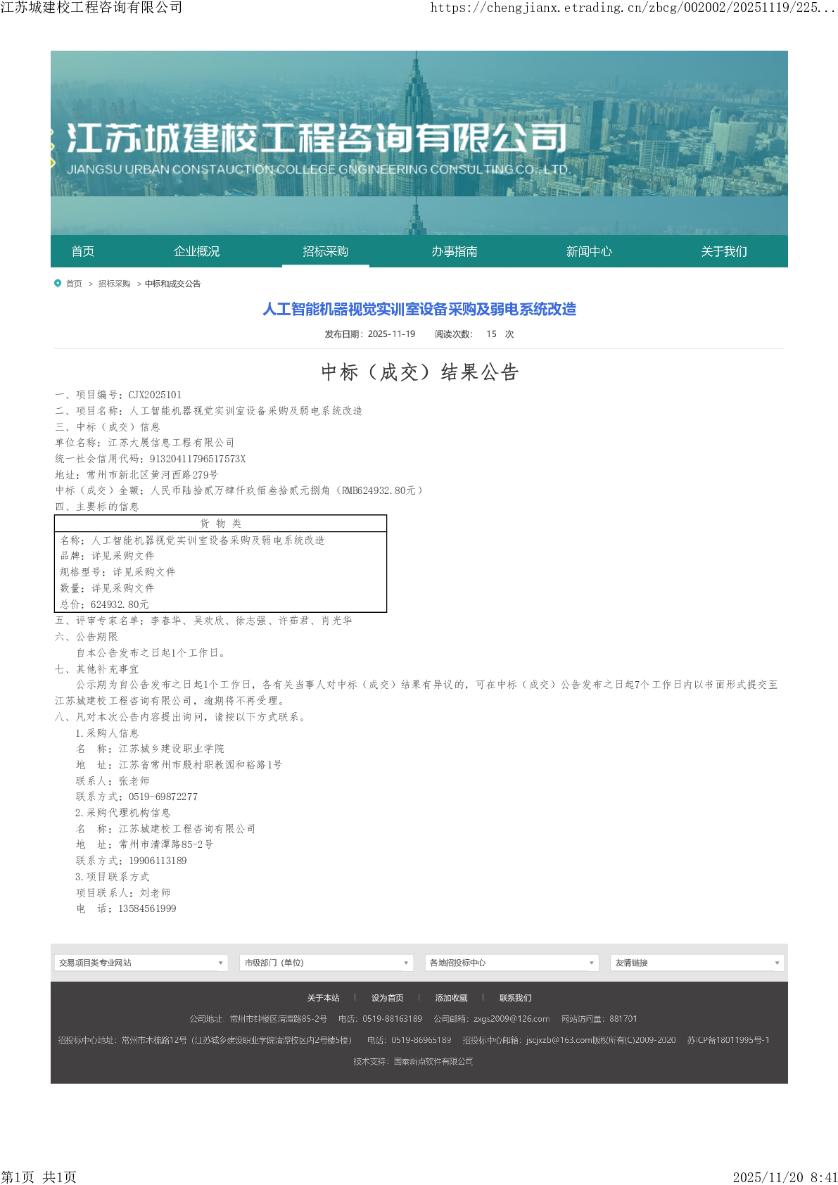 江苏城乡建设职业学院人工智能机器视觉实训室设备采购及弱电系统改造中标公告