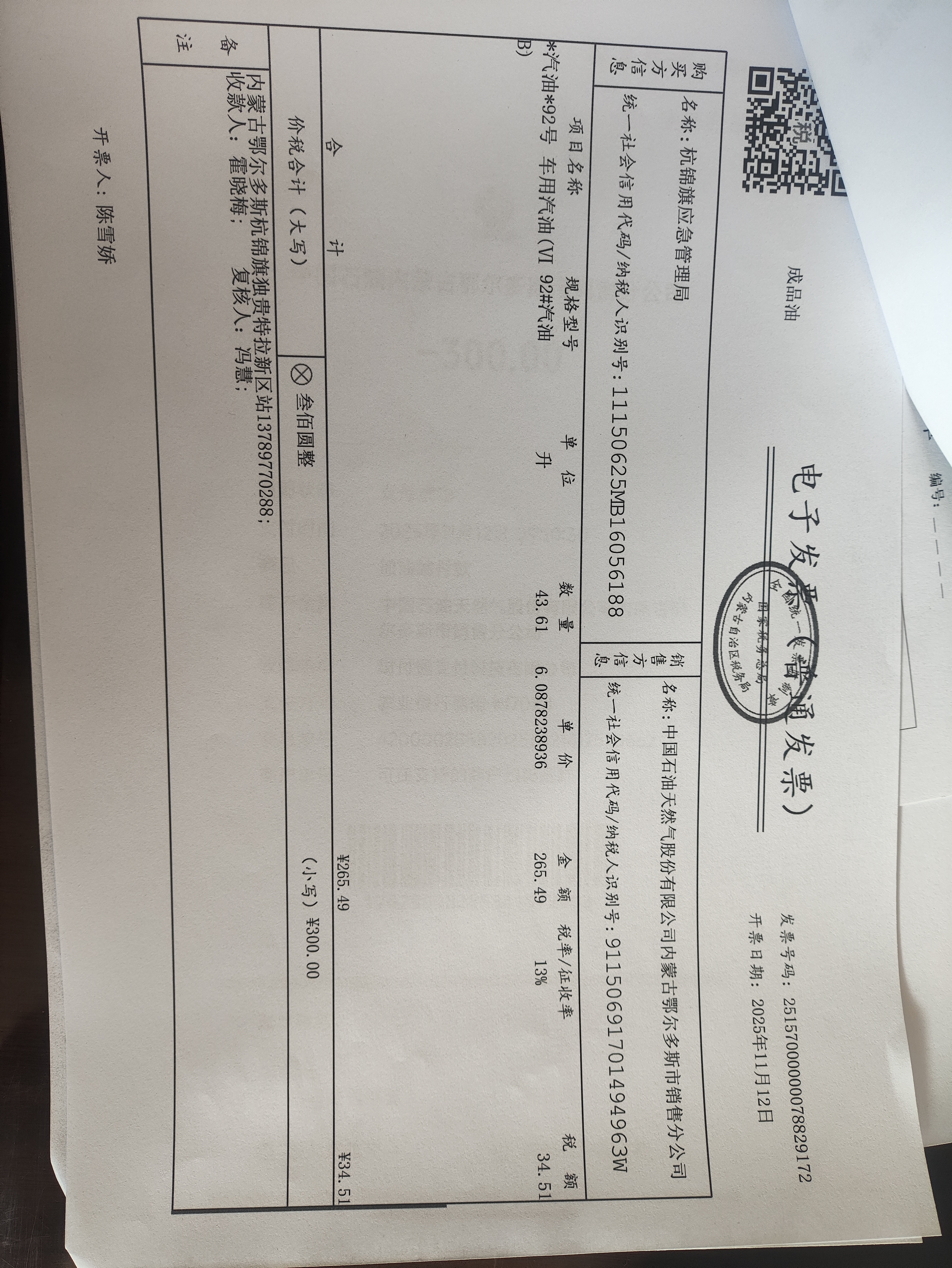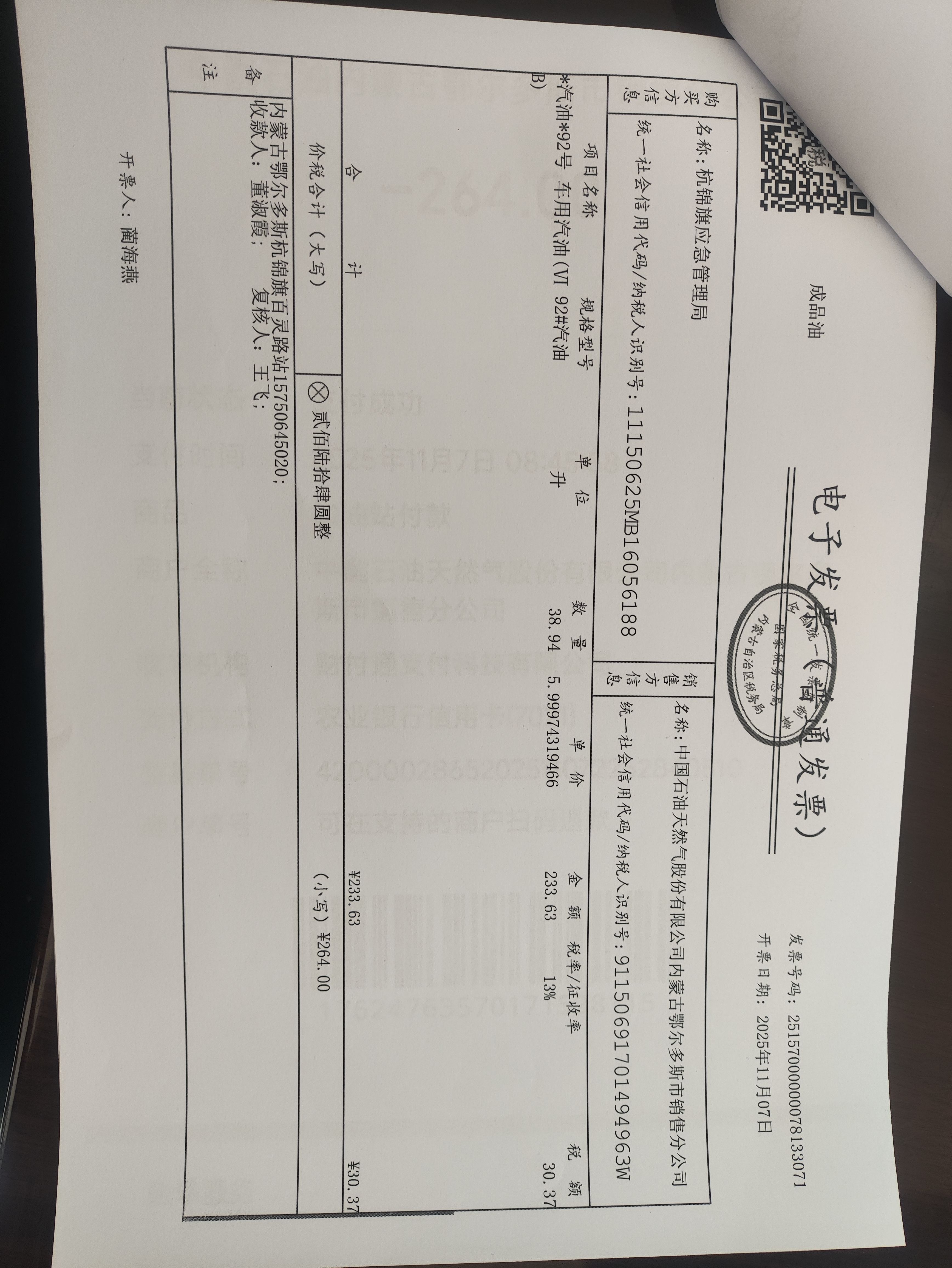 杭锦旗应急管理局车辆加油服务(蒙KB7007)政府采购合同公告