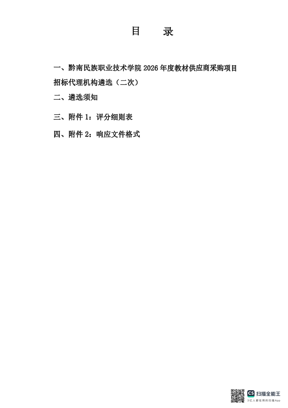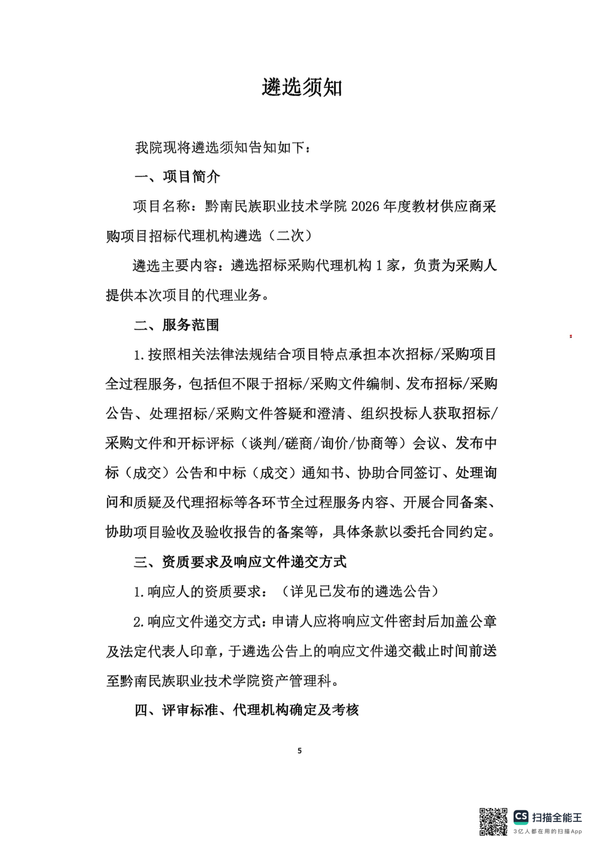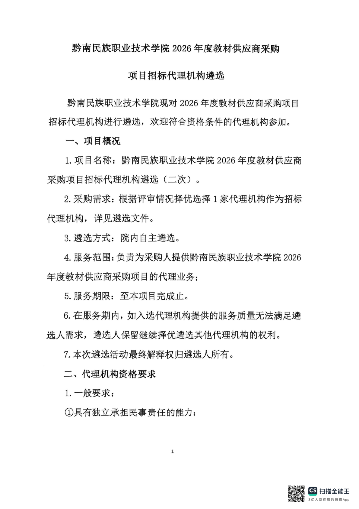 黔南民族职业技术学院2026年度教材供应商采购项目招标代理机构遴选(二次)遴选文件