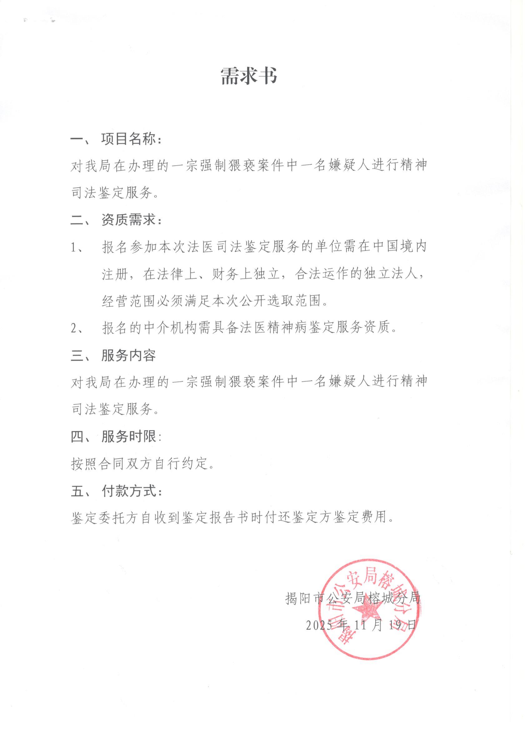 对我局在办理的一宗强制猥亵案件中一名嫌疑人进行精神司法鉴定服务。采购公告