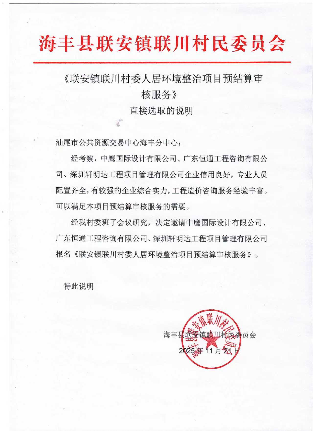 鉴于中鹰国际设计有限公司、广东恒通工程咨询有限公司公司、深圳轩明达工程项目管理有限公司企业信用良好,专业人员配置齐全,有较强的企业综合实力,工程造价咨询服务经验丰富。可以满足本工程预结算审核服务的需要。经我村委班子会议研究,决定邀请以上三家公司报名《联安镇联川村委人居环境整治项目预结算审核服务》。