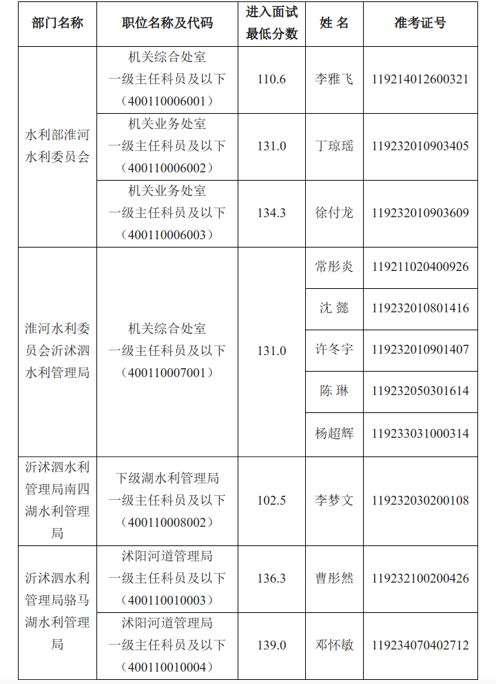 (各职位按准考证号为序)