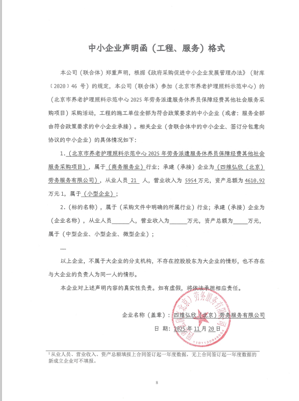 [公开]北京市养老护理照料示范中心2025年劳务派遣服务休养员保障经费其他社会服务采...