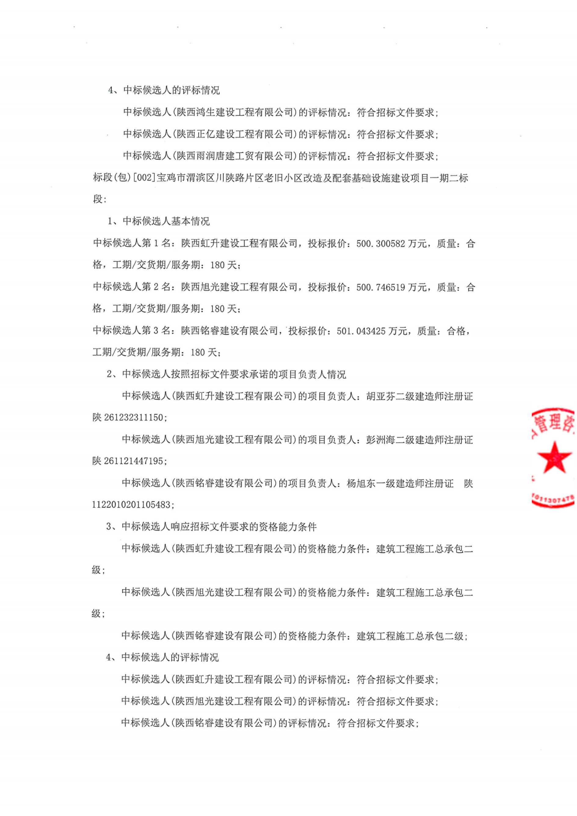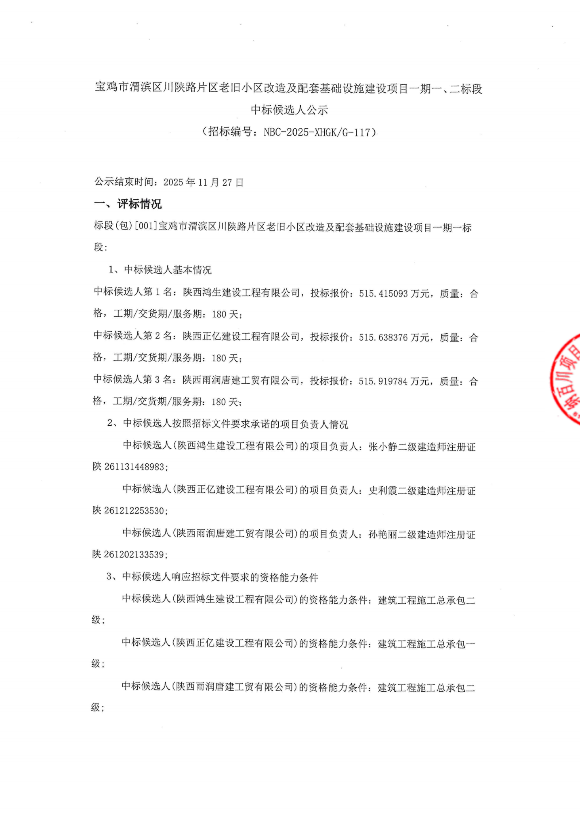 川陕路片区老旧小区改造及配套基础设施建设项目一期一、二标段中标候选人公示