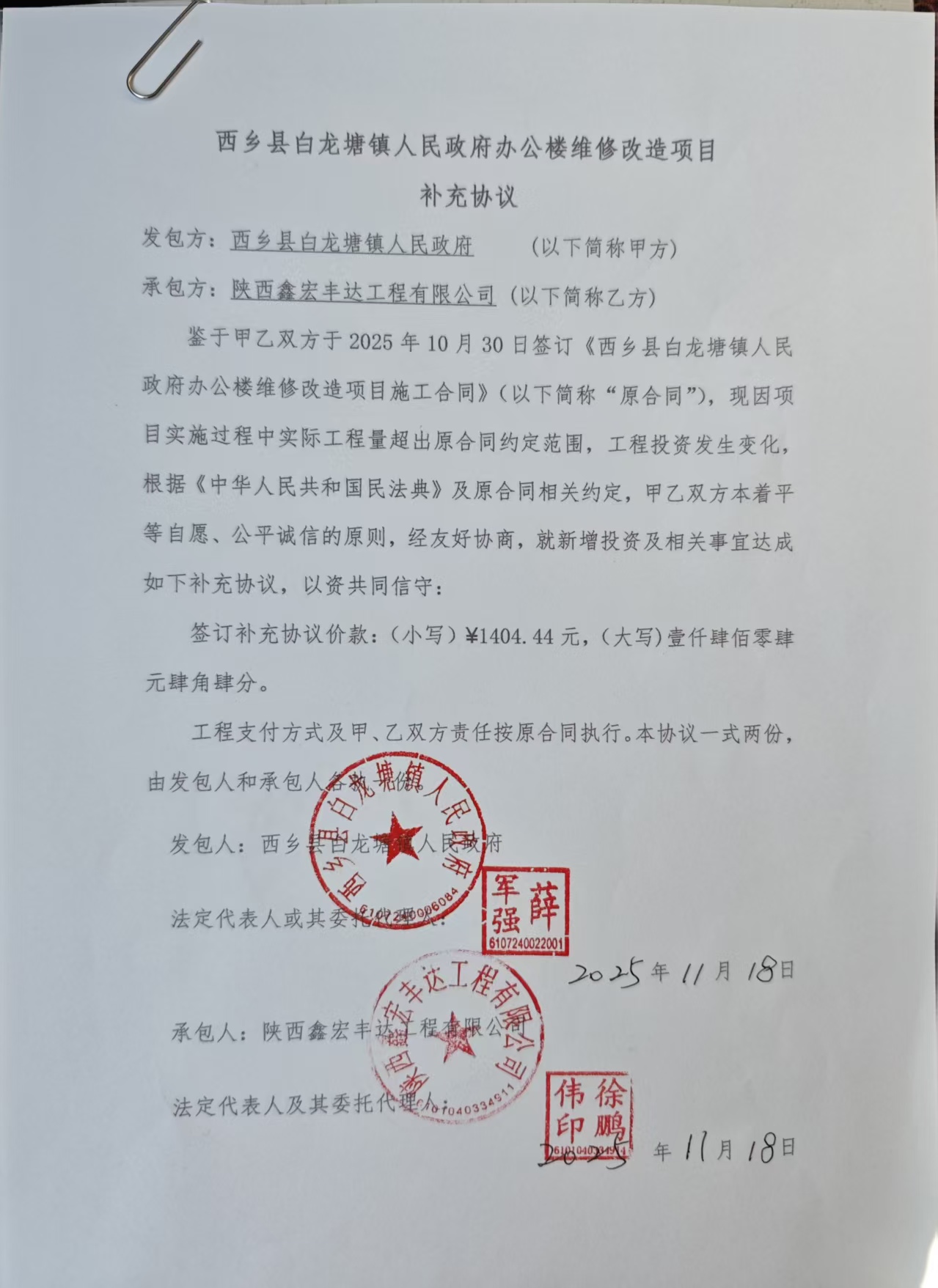二、合同名称:白龙塘镇政府办公楼水电改造维修工程