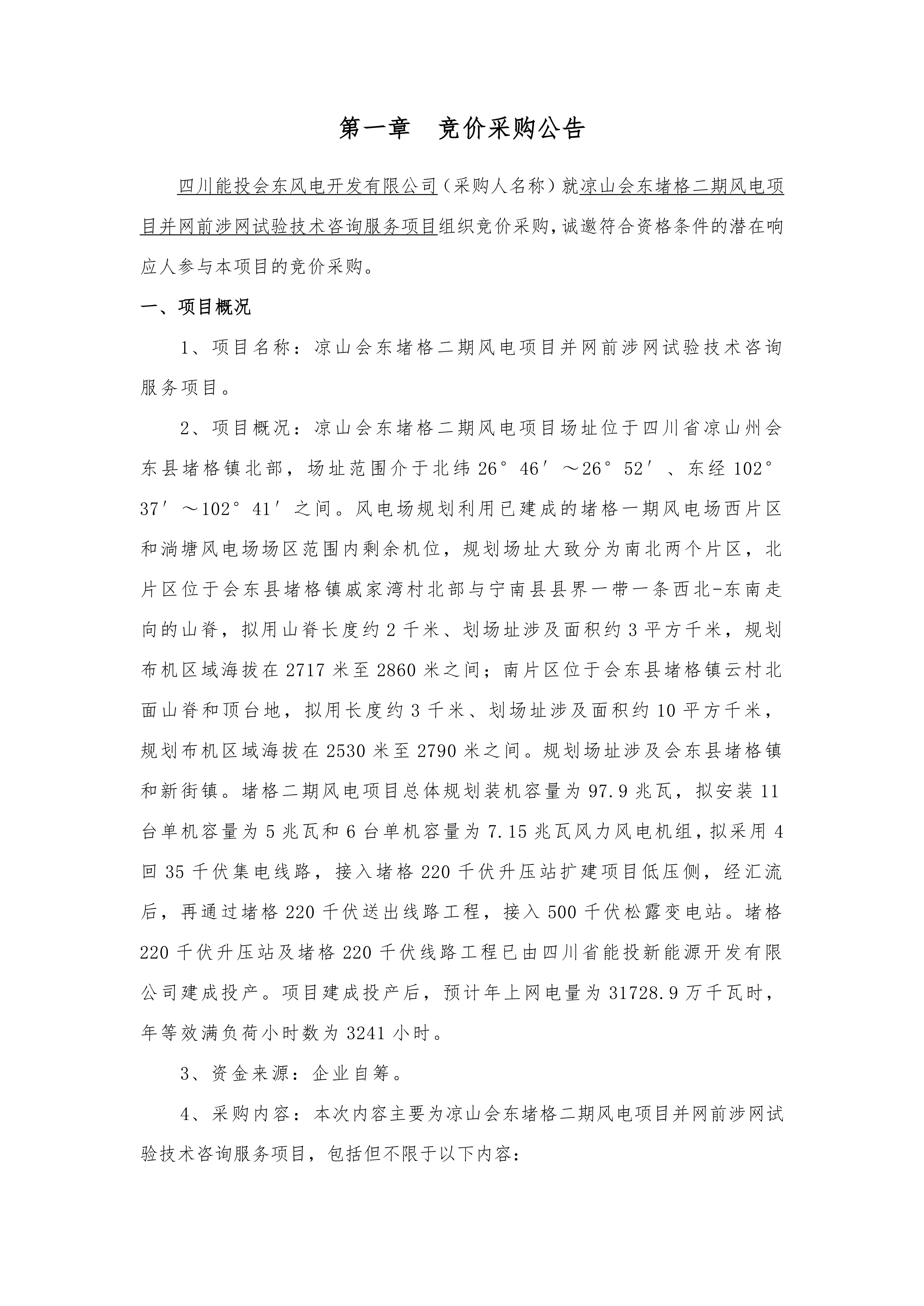 四川能投会东风电开发有限公司关于凉山会东堵格二期风电项目并网前涉网试验技术咨询服务项目的竞价采购公告