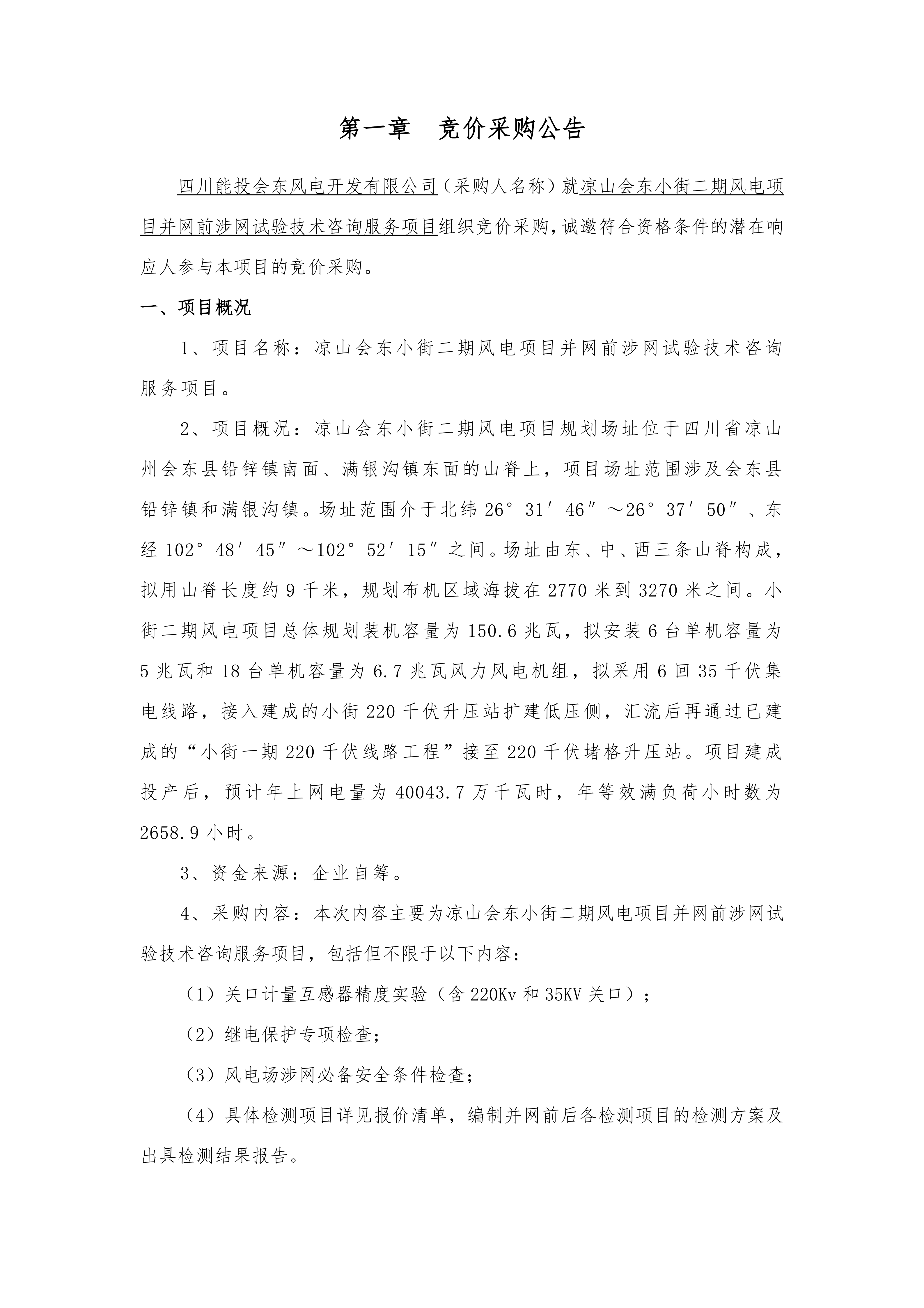 四川能投会东风电开发有限公司关于凉山会东小街二期风电项目并网前涉网试验技术咨询服务项目的竞价采购公告