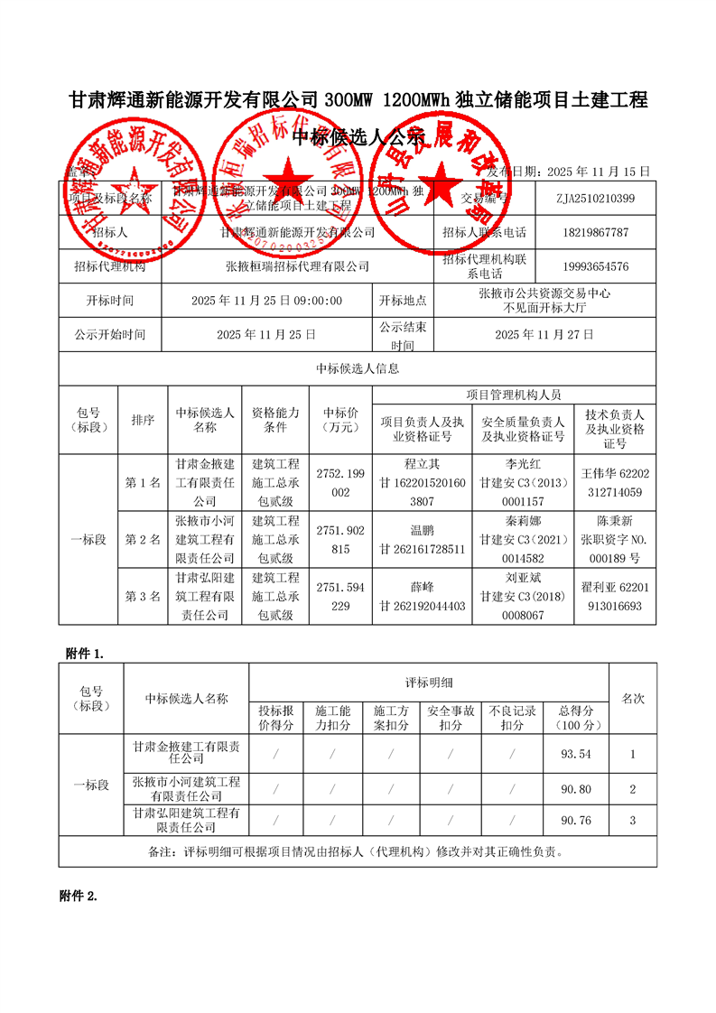 [市本级]甘肃辉通新能源开发有限公司300MW 1200MWh独立储能项目土建工程中标候选人公示