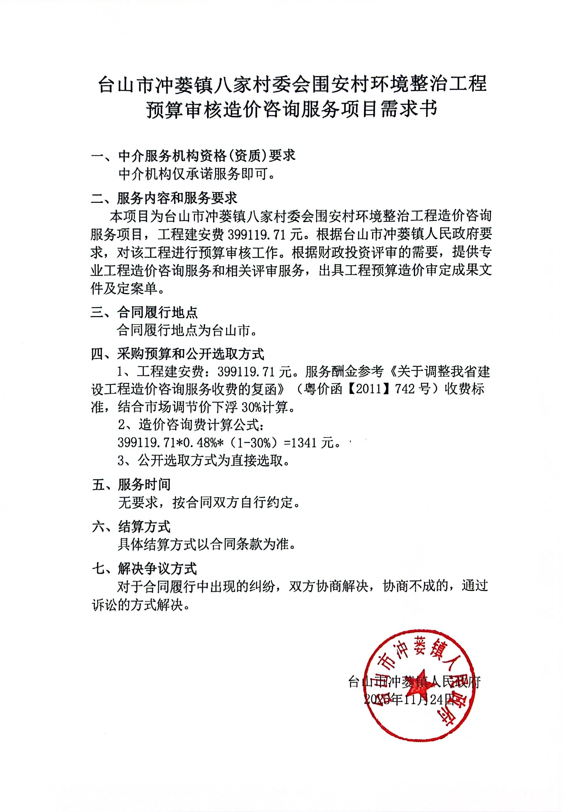 台山市冲蒌镇八家村委会围安村环境整治工程预算审核造价咨询服务项目采购公告