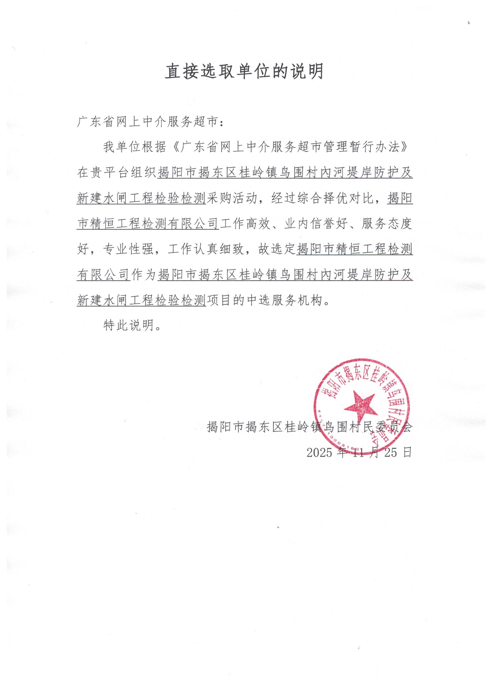 经过综合择优对比,揭阳市精恒工程检测有限公司工作高效、业内信誉好、服务态度好,专业性强,工作认真细致,故选定揭阳市精恒工程检测有限公司作为揭阳市揭东区桂岭镇鸟围村內河堤岸防护及新建水闸工程检验检测项目的中选服务机构。