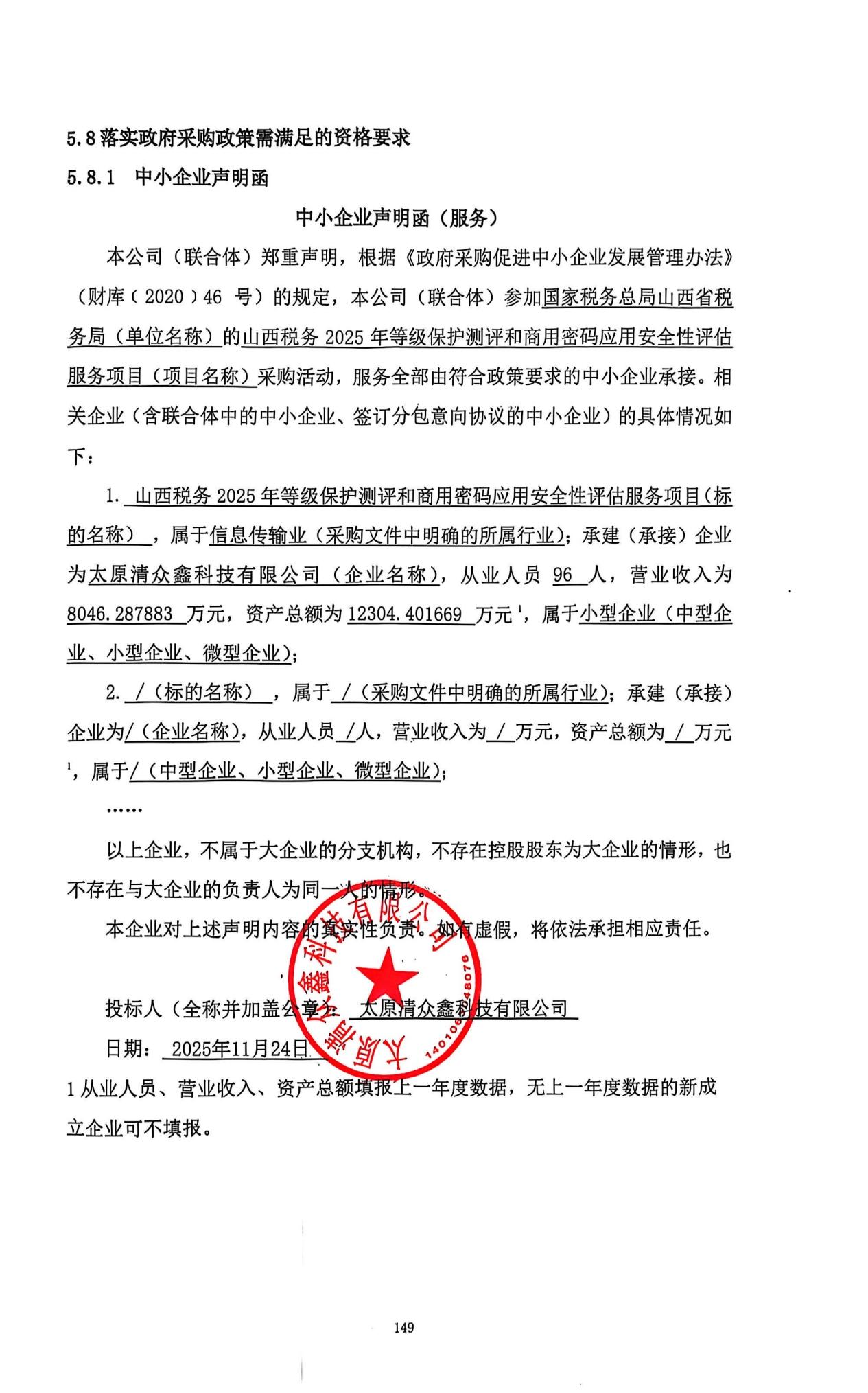 * | 太原清众鑫科技有限公司 | 山西税务****年等级保护测评和商用密码应用安全性评估服务项目 | 对定级为三级的**个应用系统、定级为二级的*个应用系统开展等级保护测评并交付测评报告;对定级为三级的**个应用系统开展商用密码应用安全性评估工作,并交付评估报告,详见采购需求。 | 详见文件采购需求 | *年 | 合格 |