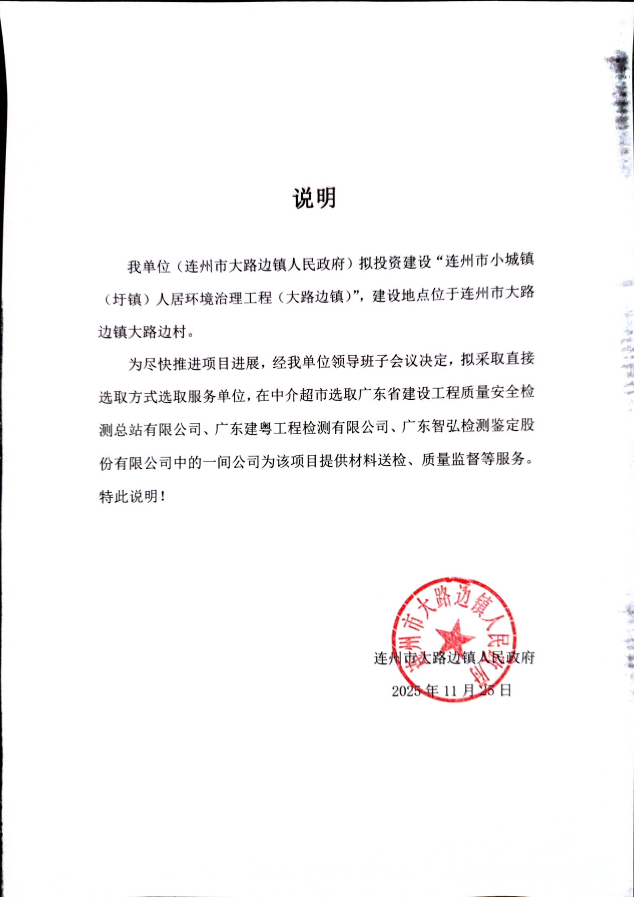 关于为【连州市小城镇(圩镇)人居环境治理工程(大路边镇)】公开选取【建设工程质量检测】机构的公告