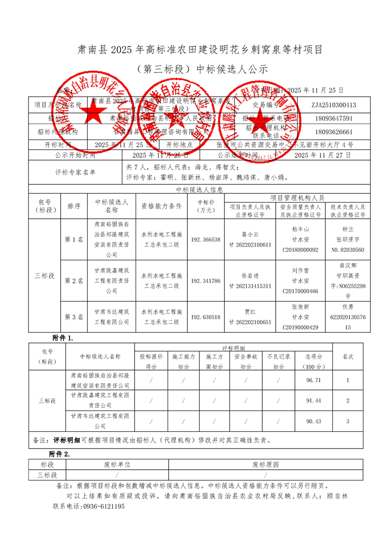 [市本级]肃南县2025年高标准农田建设明花乡刺窝泉等村项目(第三标段)中标候选人公示