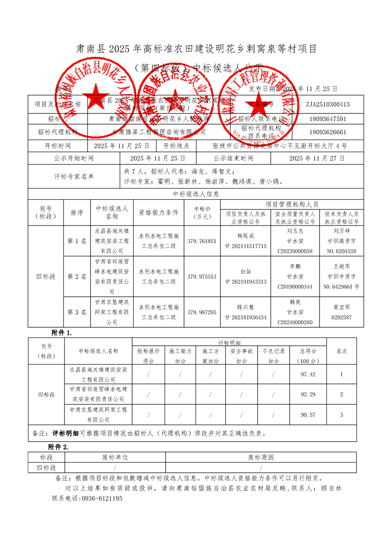 [市本级]肃南县2025年高标准农田建设明花乡刺窝泉等村项目(第四标段)中标候选人公示交易结果公示