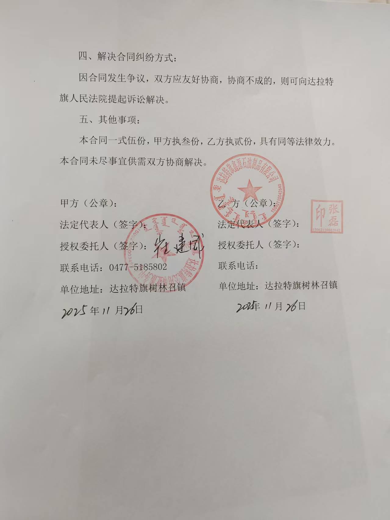 合同金额: *,***.**元,大写(人民币):叁仟玖佰柒拾叁元整 履约期限:****年**月**日至****年**月**日 履约地点:达拉特旗鑫源石油制品有限公司 采购方式: 七、合同签订日期****年**月**日 八、合同公告日期****年**月**日 九、其他补充事宜