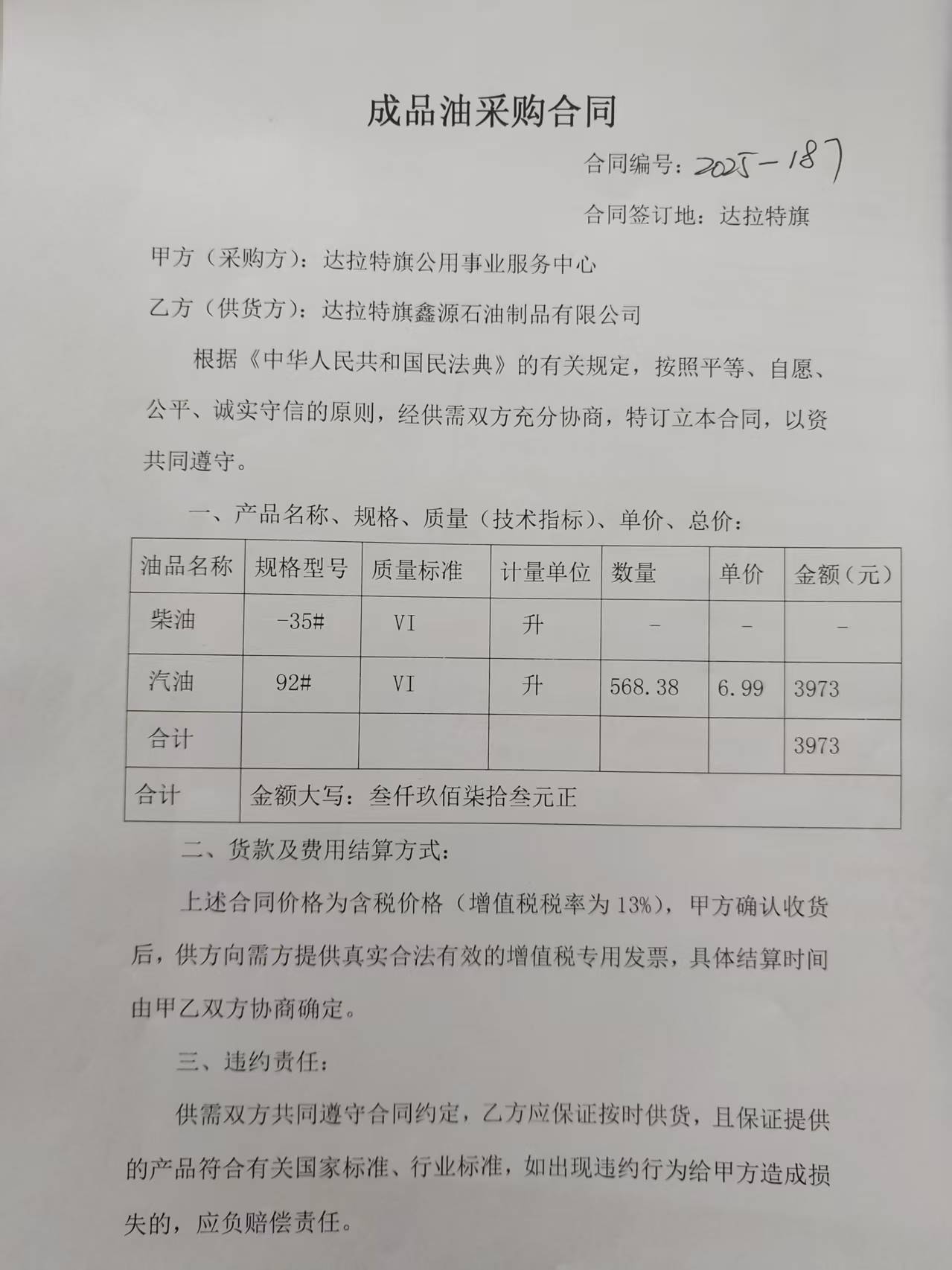 达拉特旗公用事业服务中心成品油采购合同政府采购合同公告