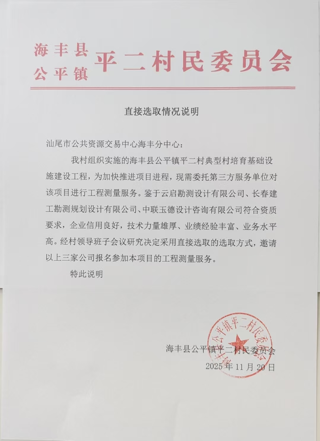 鉴于云启勘测设计有限公司、长春建工勘测规划设计有限公司、中联玉德设计咨询有限公司符合资质要求,企业信用良好,技术力量雄厚、业绩经验丰富、业务水平高。经村领导班子会议研究决定采用直接选取的选取方式,邀请以上三家公司报名参加本项目的工程测量服务。