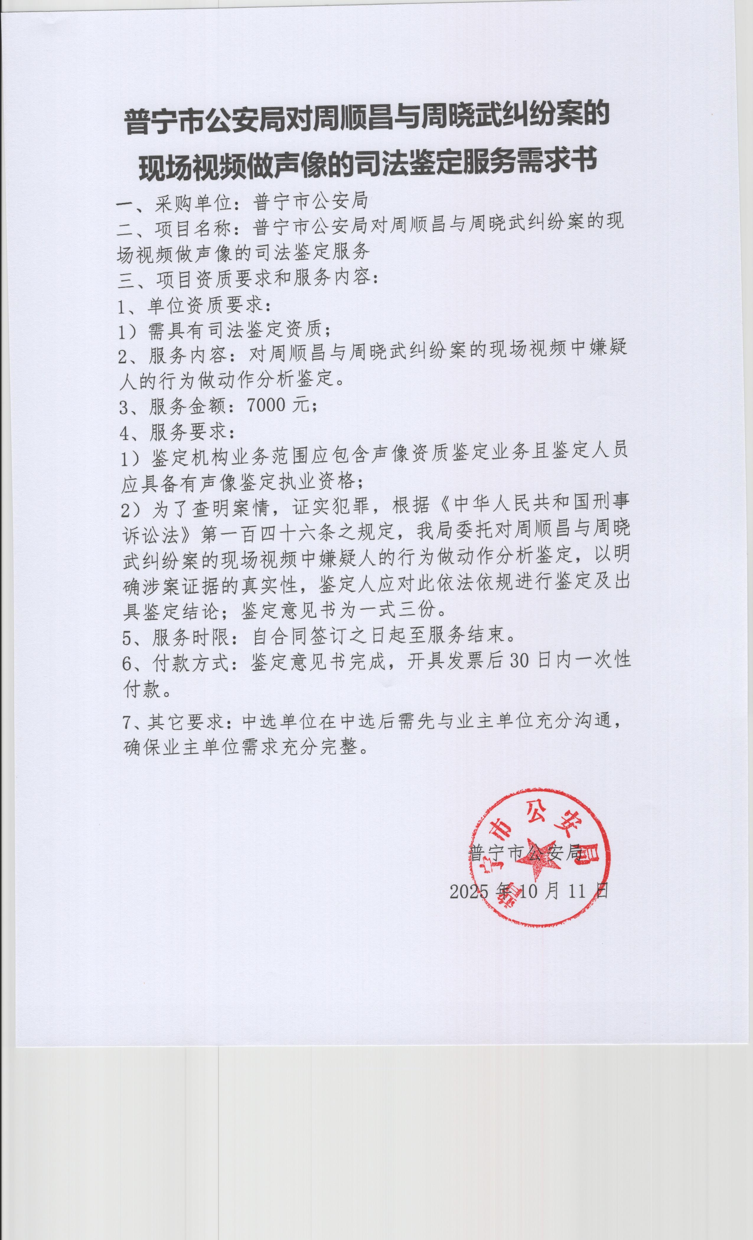 普宁市公安局对周顺昌与周晓武纠纷案的现场视频做声像的司法鉴定服务采购公告