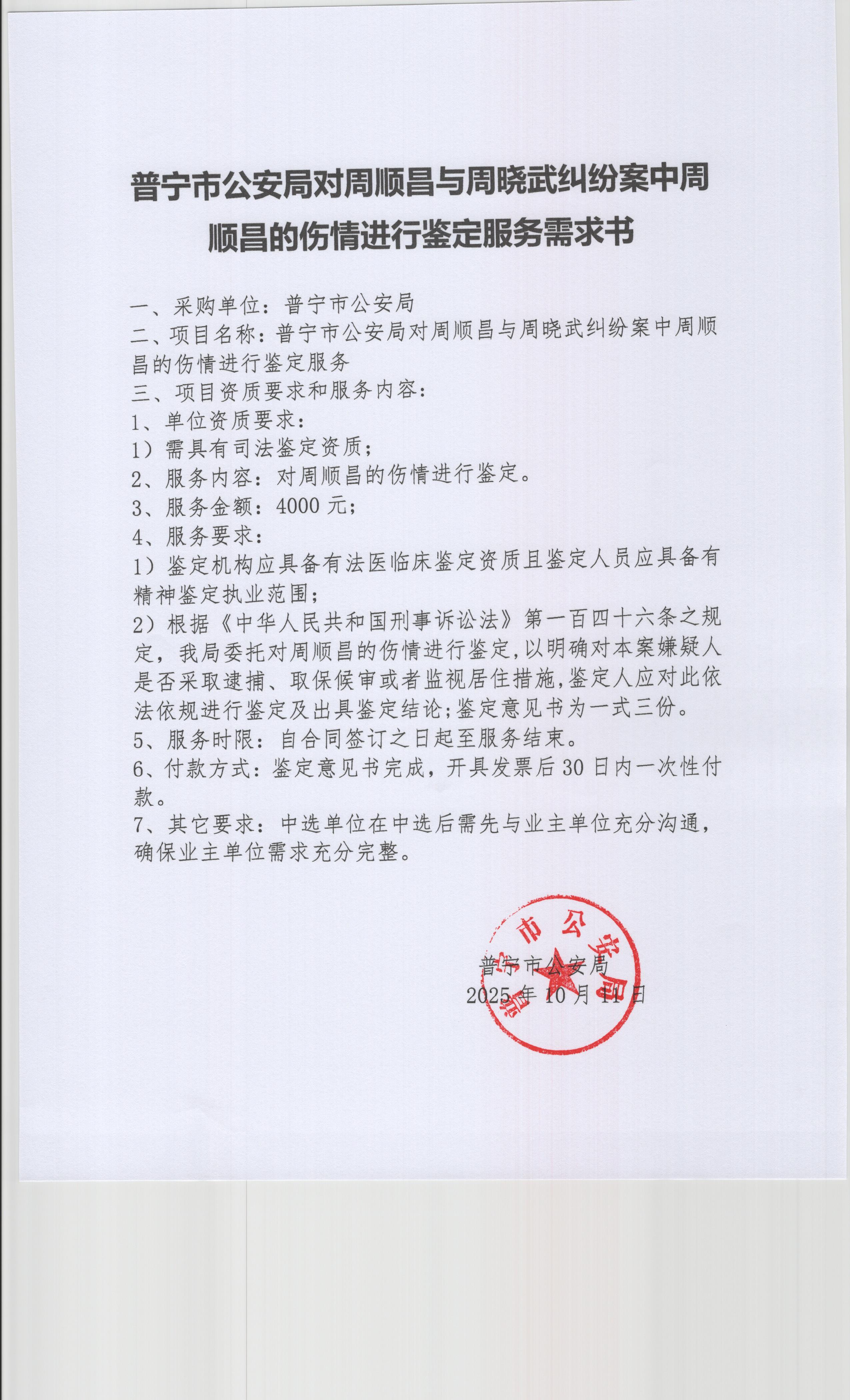 普宁市公安局对周顺昌与周晓武纠纷案中周顺昌的伤情进行鉴定服务采购公告