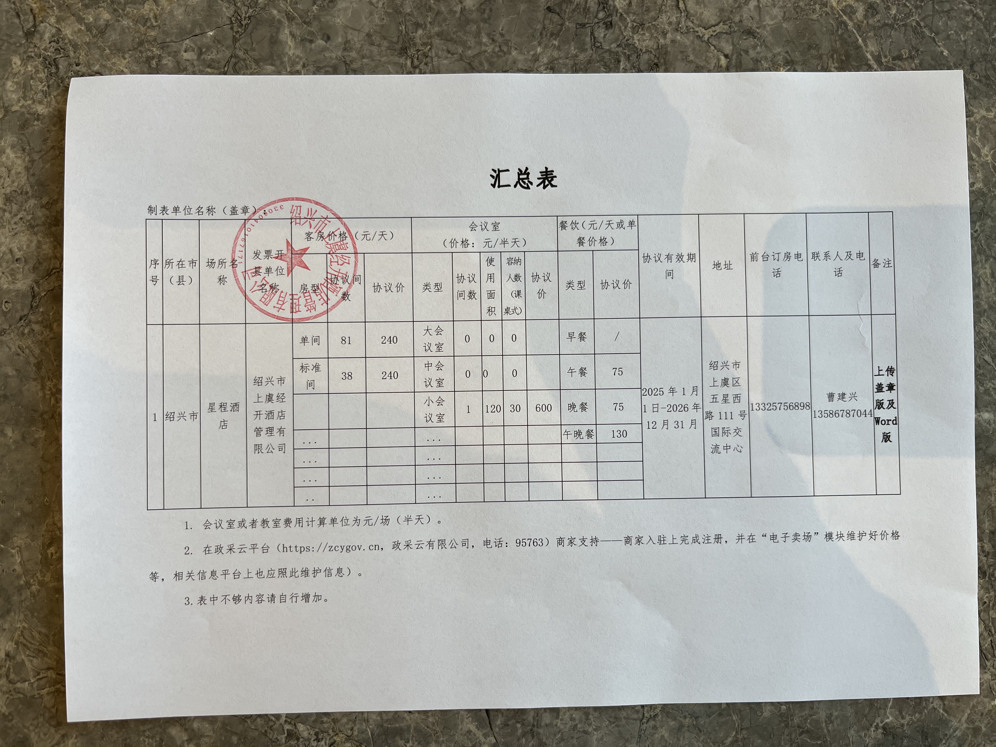 供应商名称:绍兴市上虞经开酒店管理有限公司