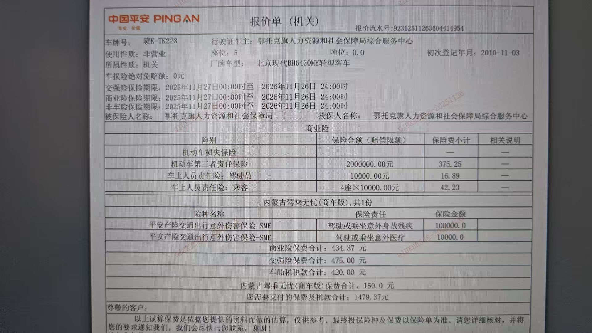 鄂托克旗人力资源和社会保障局蒙KTK228公务车保险政府采购合同公告
