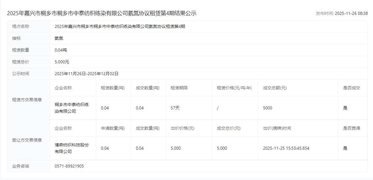 纺织练染有限公司氨氮协议租赁第4期结果公示