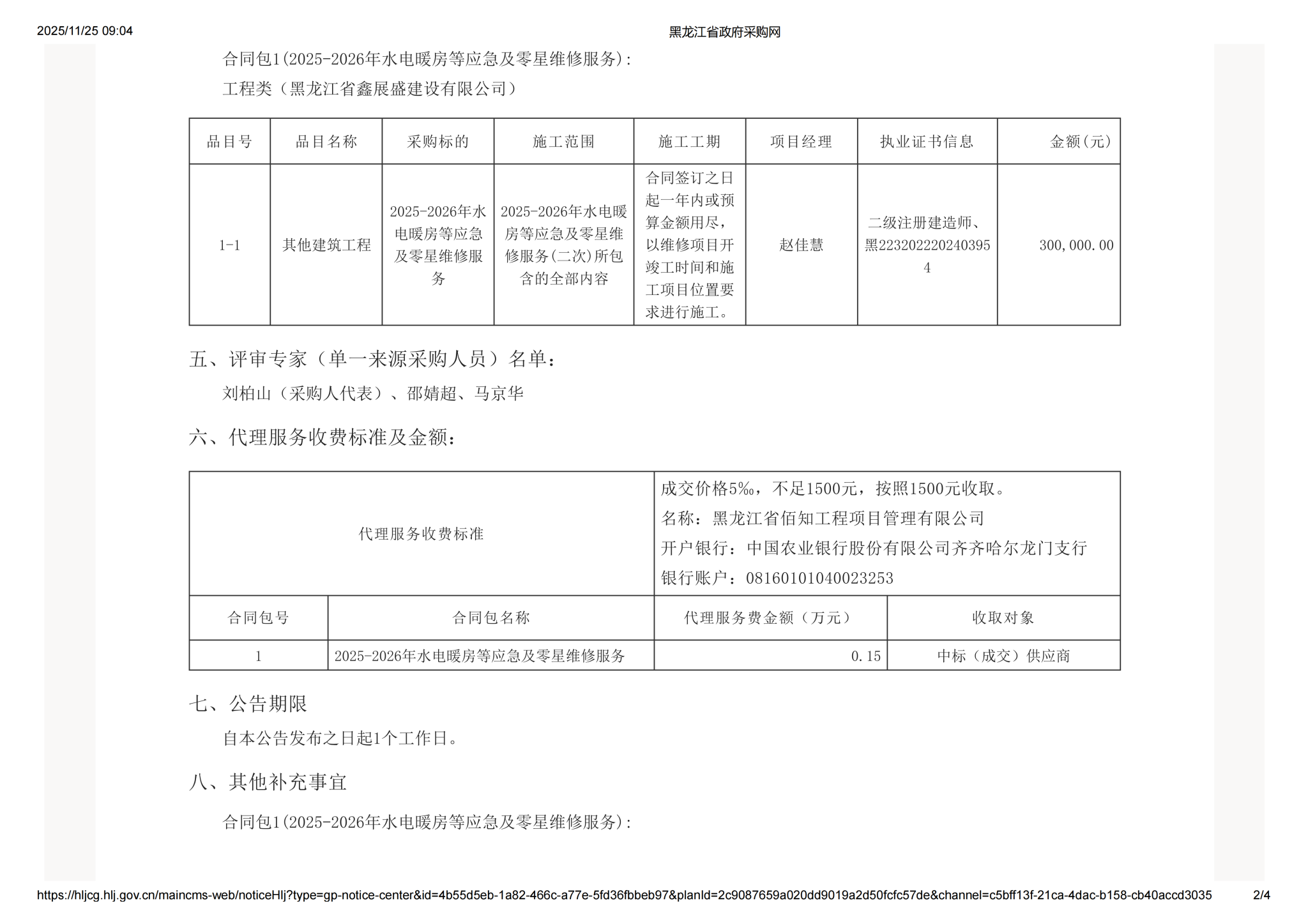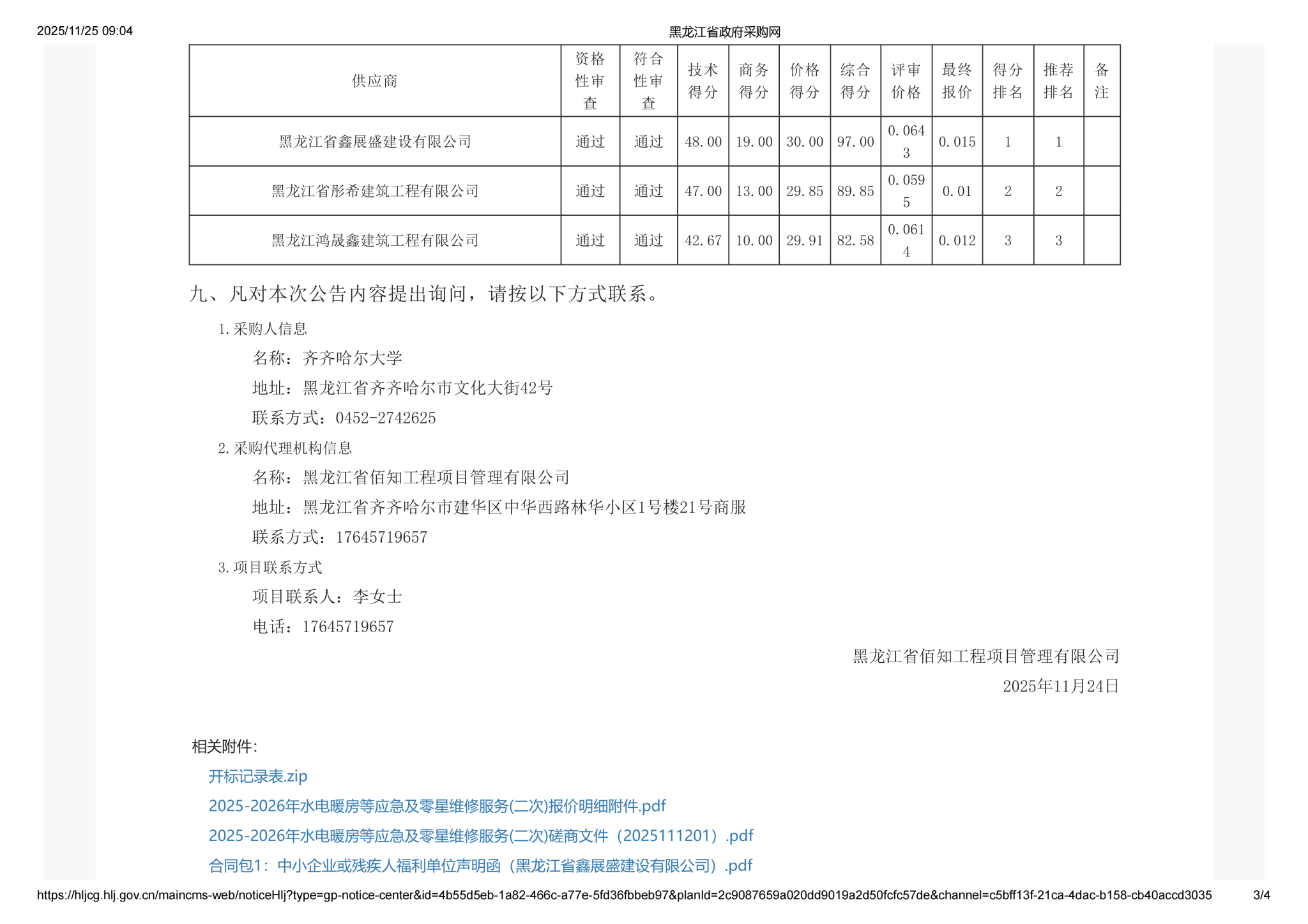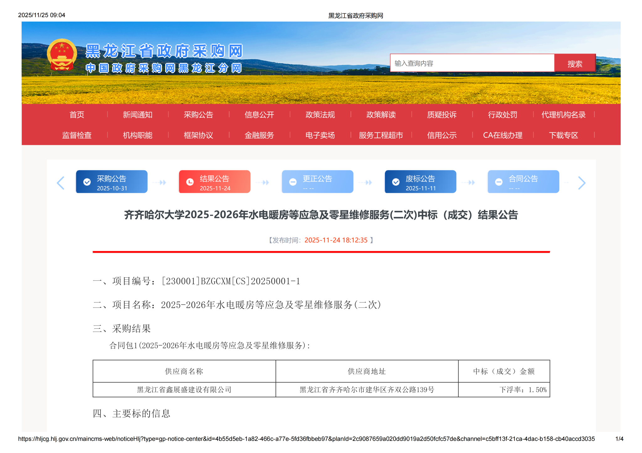 齐齐哈尔大学2025-2026年水电暖房等应急及零星维修服务(二次)中标(成交)结果公告(转自黑龙江省政府采购网)