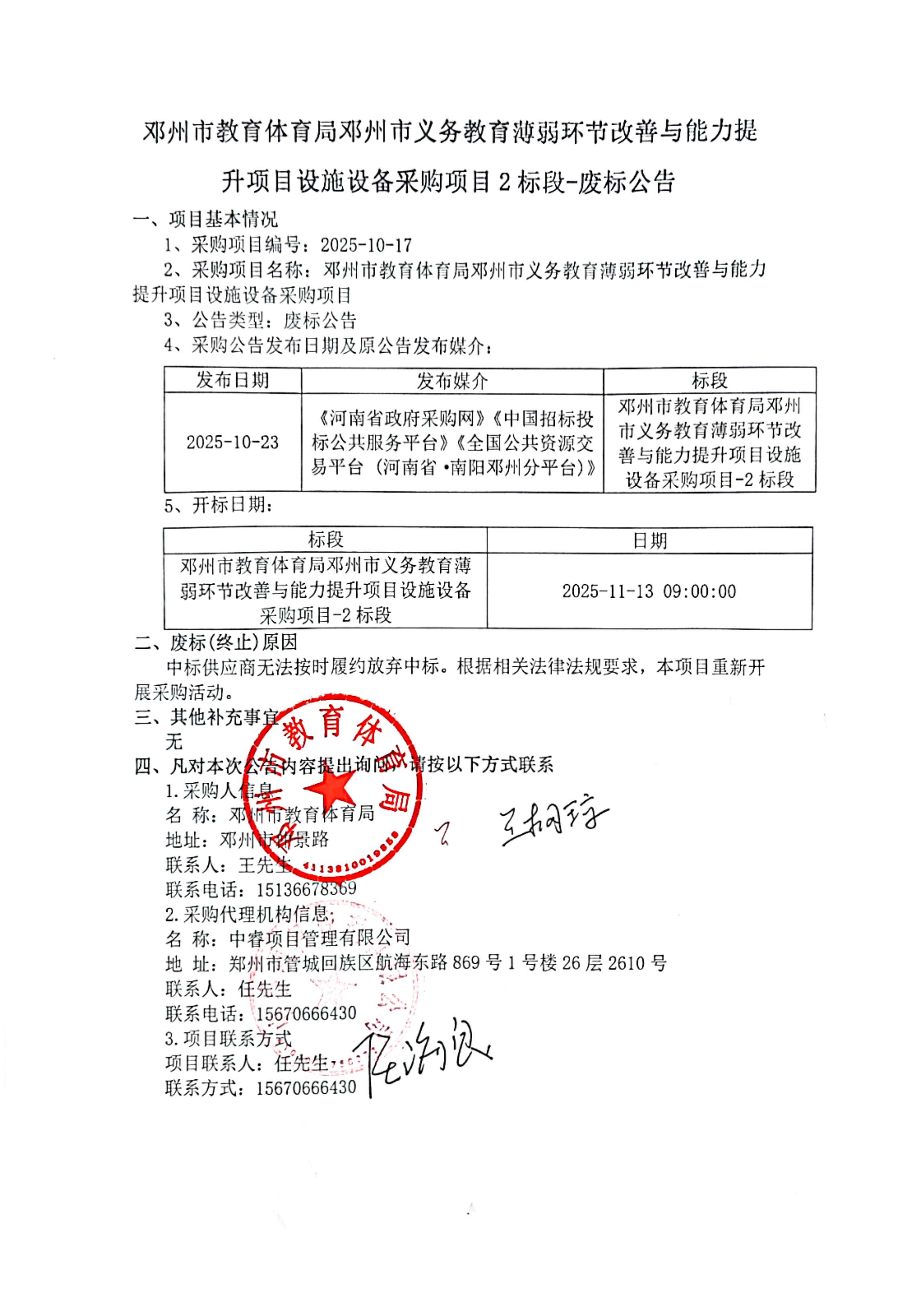 邓州市教育体育局邓州市义务教育薄弱环节改善与能力提升项目设施设备采购项目2标段-废标公告