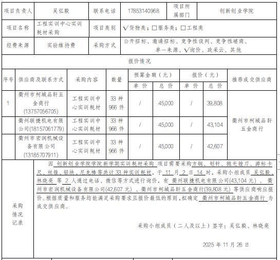 [分散采购]工程实训中心实训耗材采购项目公示 |