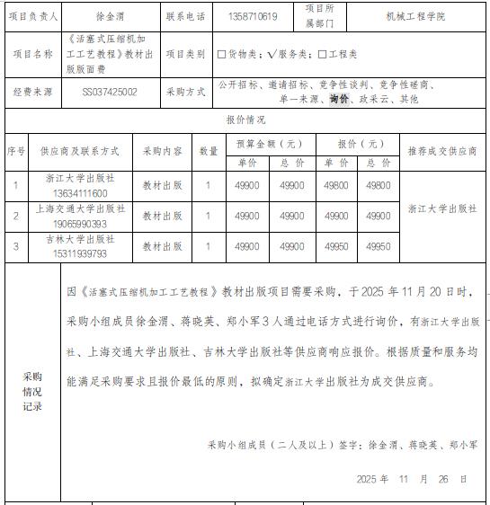 [分散采购]《活塞式压缩机加工工艺教程》教材出版服务采购项目公示 |